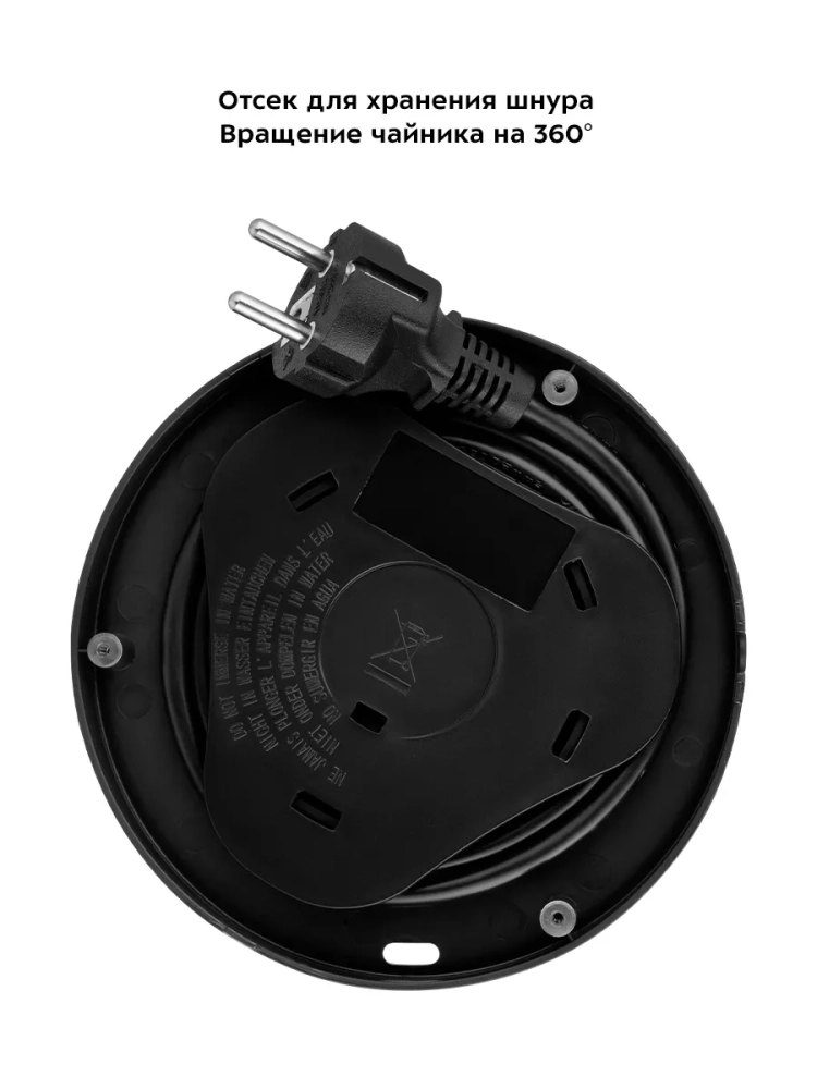 Подставка с центральным контактом дает возможность располагать на ней чайник в любом положении, обеспечивая вращение на 360°. Снизу имеется отсек для хранения шнура, в который можно смотать излишки шнура электропитания, чтобы он не мешал на столе.