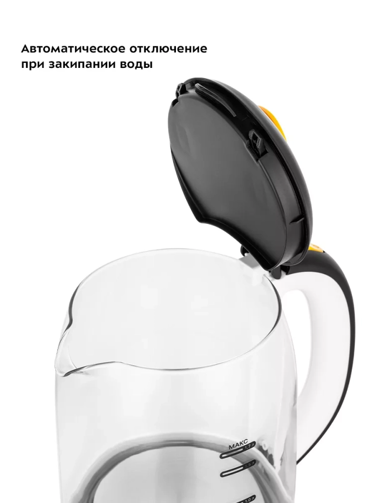 Чайник автоматически отключается при закипании, имеет защиту от перегрева и от включения без воды.