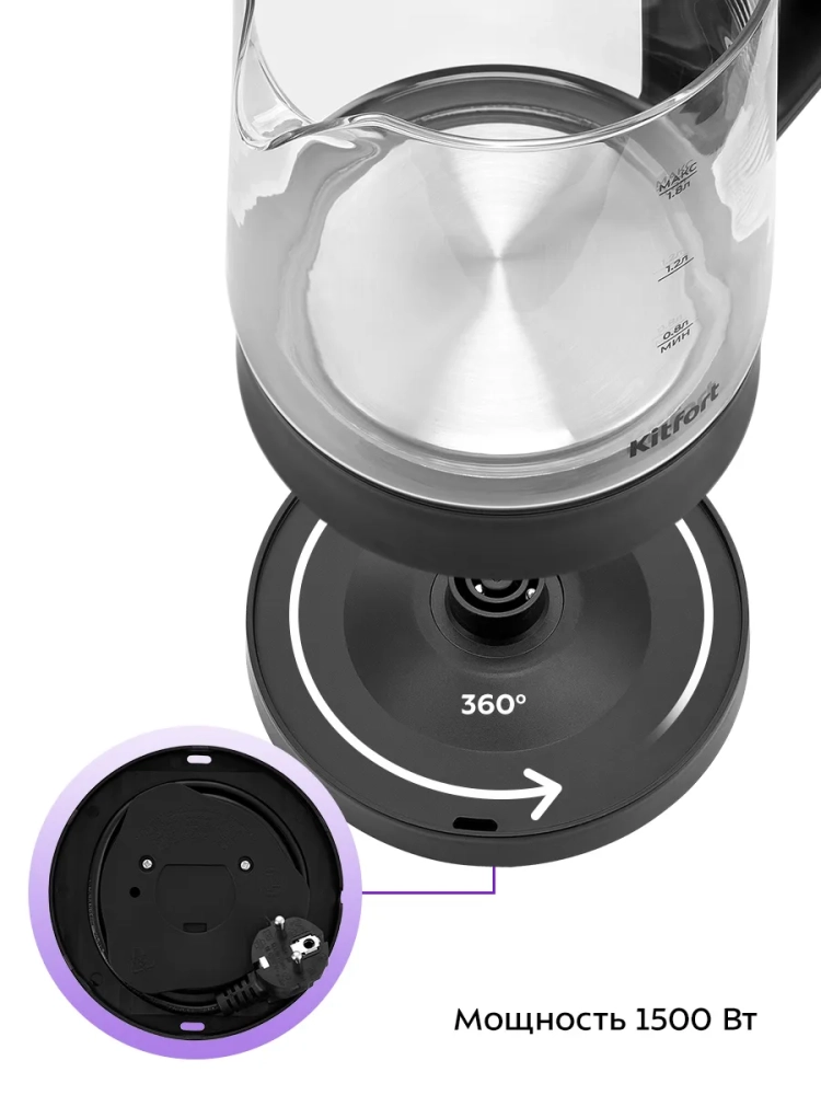 Подставка с центральным контактом дает возможность располагать на ней чайник в любом положении, обеспечивая вращение на 360°. Снизу имеется отсек для хранения шнура, в который можно смотать излишки шнура электропитания, чтобы он не мешал на столе.