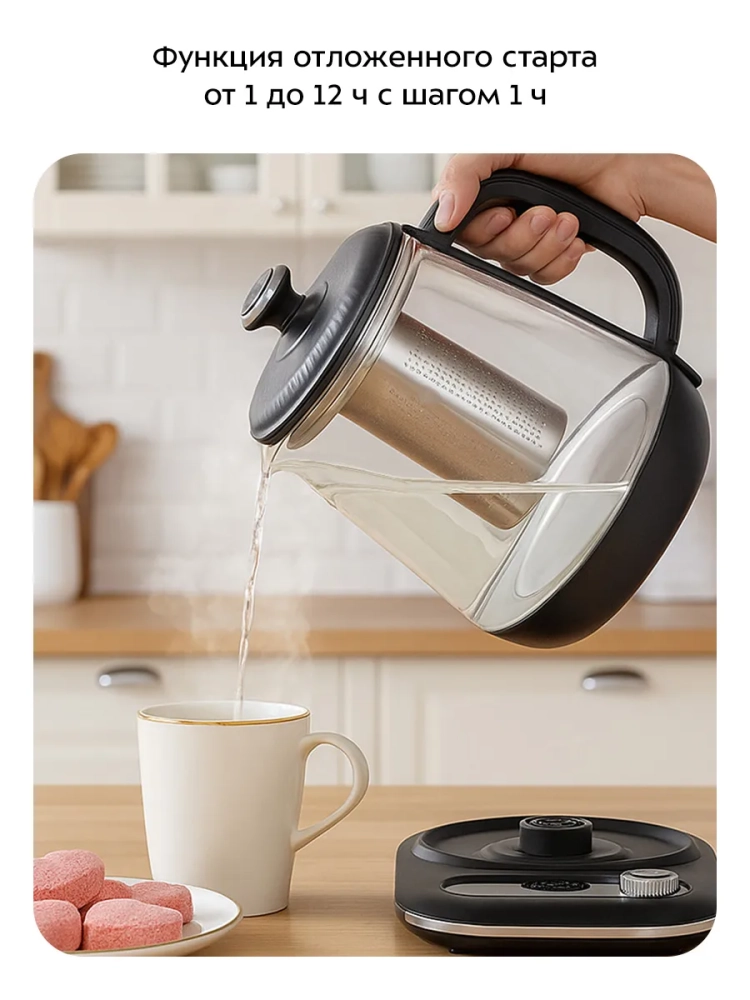 Чайник оснащен функциями отложенного старта и поддержания температуры в течение 12 часов. Данные функции могут быть использованы вместе. Функция отложенного старта позволит начать выполнение программы через заданное вами время: от 1 до 12 ч с шагом 1 ч. Температура поддержания настраивается от 45 до 90 °С с шагом 5 °С. Температура воды контролируется встроенным в дно чайника термодатчиком.