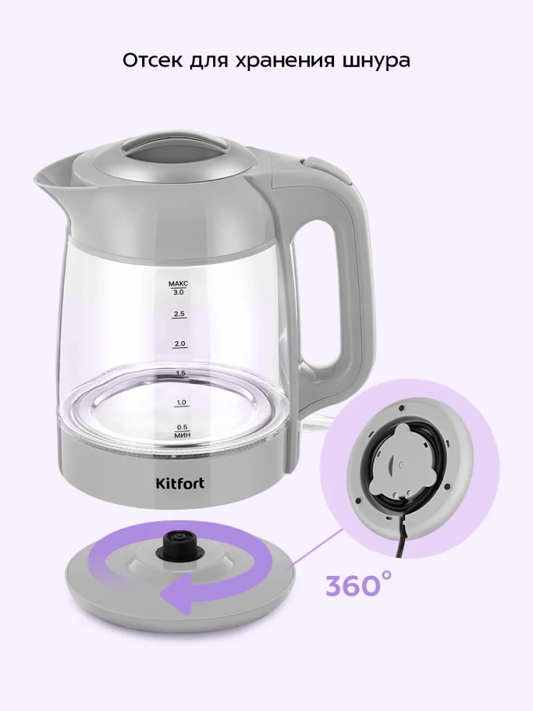 Подставка с центральным контактом дает возможность располагать на ней чайник в любом положении, обеспечивая вращение на 360°. Снизу имеется отсек для хранения шнура, в который можно смотать излишки шнура электропитания, чтобы он не мешал на столе.