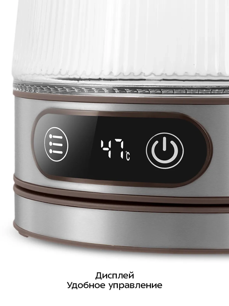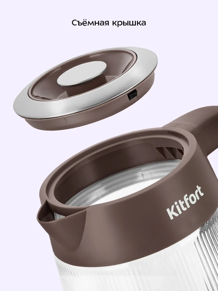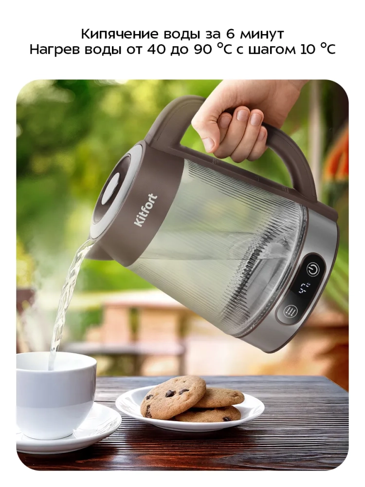 Электрический чайник Kitfort КТ-8710 может не только вскипятить воду, но и нагреть ее от 40 до 90 °С с шагом 10 °С, что очень удобно при заваривании различных сортов чая. Чайник также оснащен функцией поддержания температуры в течение 2 часов. Температура воды контролируется встроенным термодатчиком.