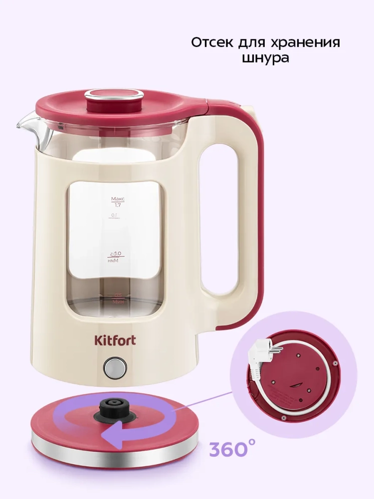 Подставка с центральным контактом дает возможность располагать на ней чайник в любом положении, обеспечивая вращение на 360°. Снизу имеется отсек для хранения шнура, в который можно смотать излишки шнура электропитания, чтобы он не мешал на столе.