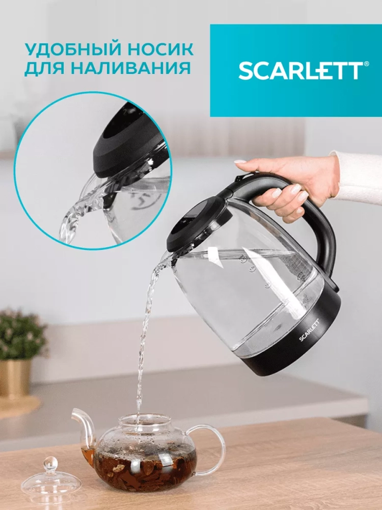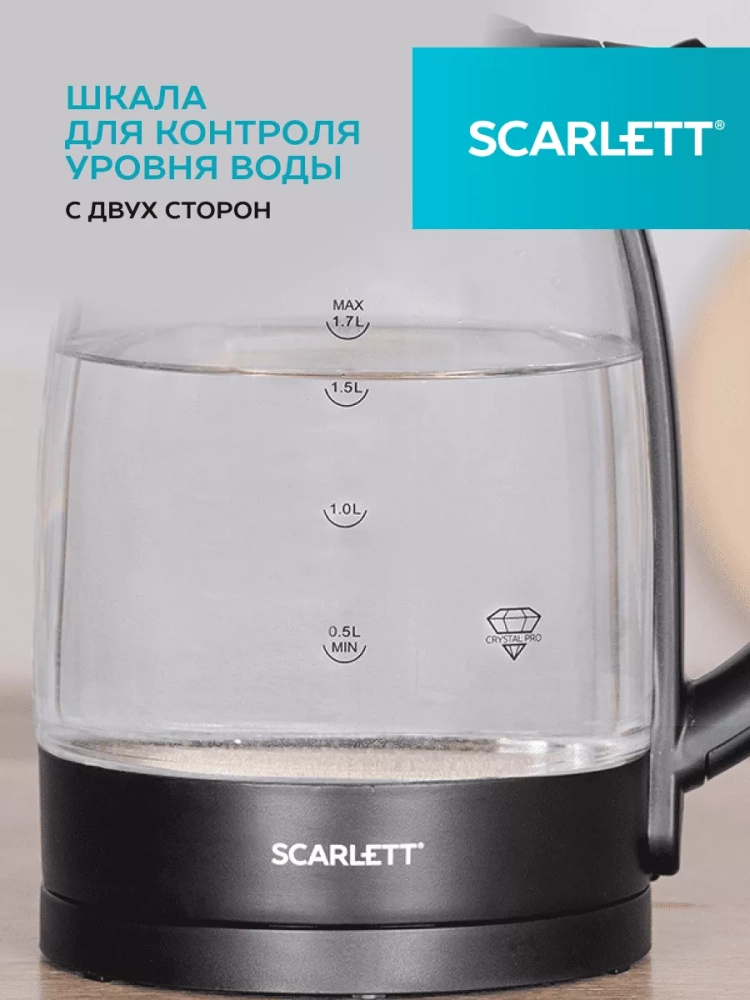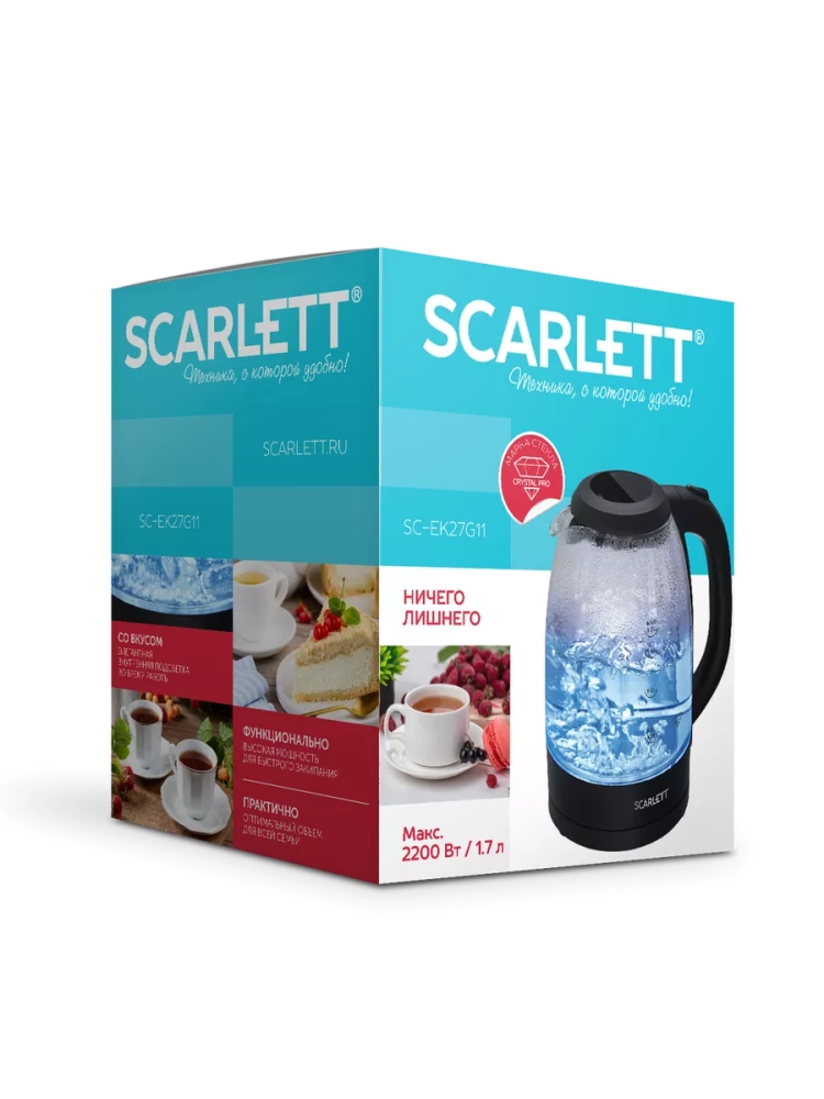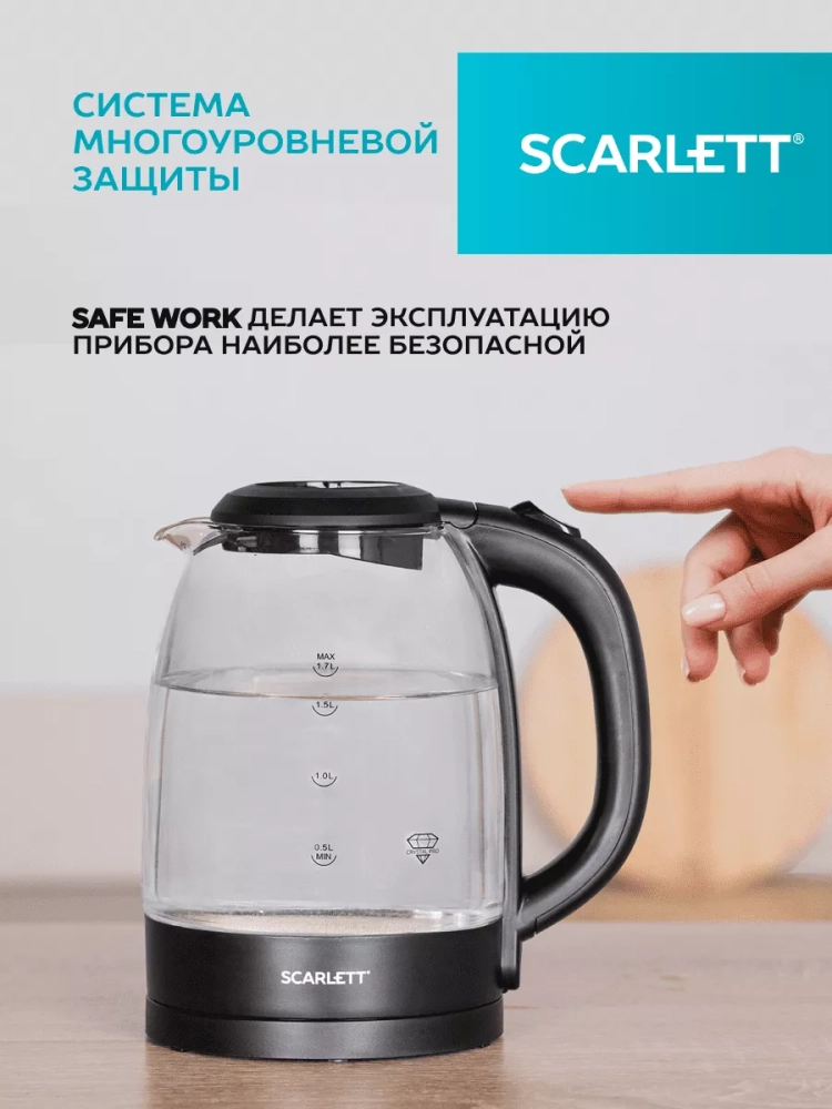 Scarlett SC-EK27G11 – электрический чайник мощностью 2200 Вт и объемом 1.7 л оснащён традиционной системой открывания крышки. Эргономичная ручка и закрытый нагревательный элемент сделают эксплуатацию прибора еще проще и комфортнее. Внутренняя подсветка позволит наблюдать за завораживающим процессом кипячения. Система защиты SAFE WORK с автоотключением при закипании и защитой от включения без воды сделает эксплуатацию прибора безопасной.