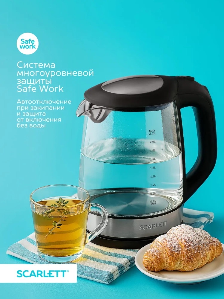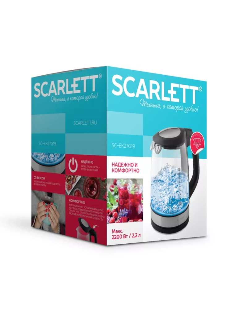 Корпус чайника SC-EK27G19 выполнен из стекла марки Crystal Pro, что позволяет сохранять полезные свойства воды и наблюдать за процессом кипячения. Увеличенный объем 2.2 л позволяет прибору стать идеальным решением для большой семьи или офиса. Элегантная внутренняя подсветка во время работы прибора создаст дополнительный уют на кухне. Автоматическая система открывания крышки делает прибор более комфортным в использовании. Нейлоновый фильтр позаботится о качестве воды. Также прибор оснащён системой безопасности Safe Work - автоотключение при закипании и защита от закипания с недостаточным количеством воды. Классический дизайн прибора станет удачным решением на кухне!