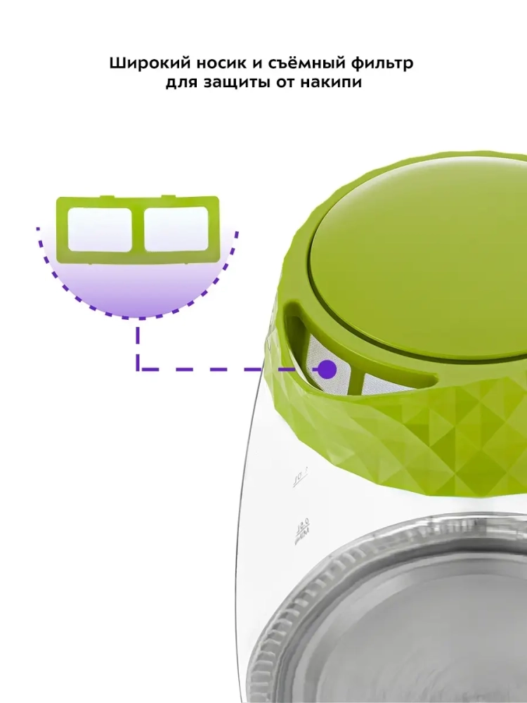 Чайник автоматически отключается при закипании, имеет защиту от перегрева и от включения без воды. В носике чайника расположен съемный фильтр от накипи.