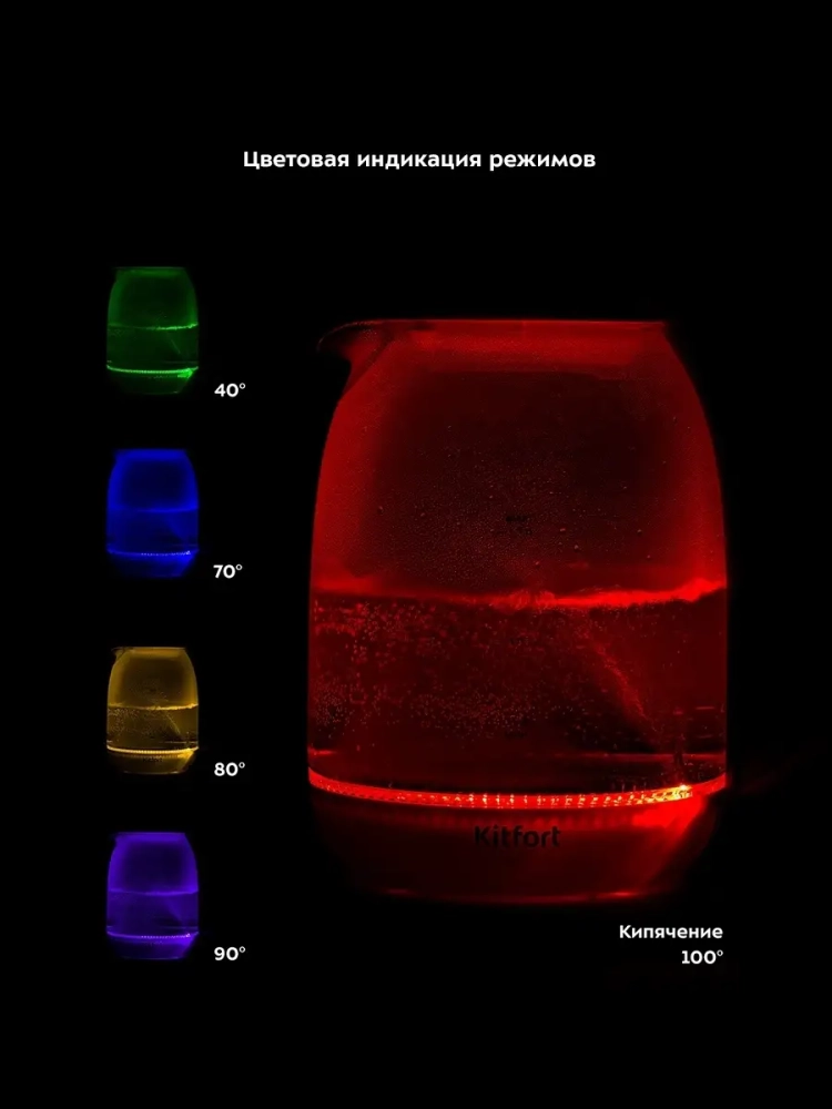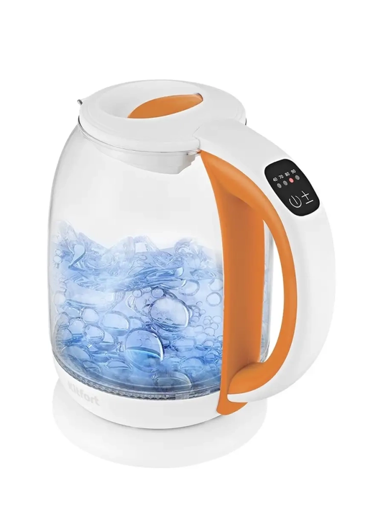 Электрический чайник с электронным терморегулятором Kitfort КТ-6140 может не только вскипятить воду, но и нагреть ее до температуры 40, 70, 80 и 90 °С, что очень удобно при заваривании различных сортов чая. Температура 40 *С пригодится для приготовления детского питания. Чайник также оснащен функцией поддержания температуры. Температура воды контролируется встроенным в дно чайника термодатчиком.