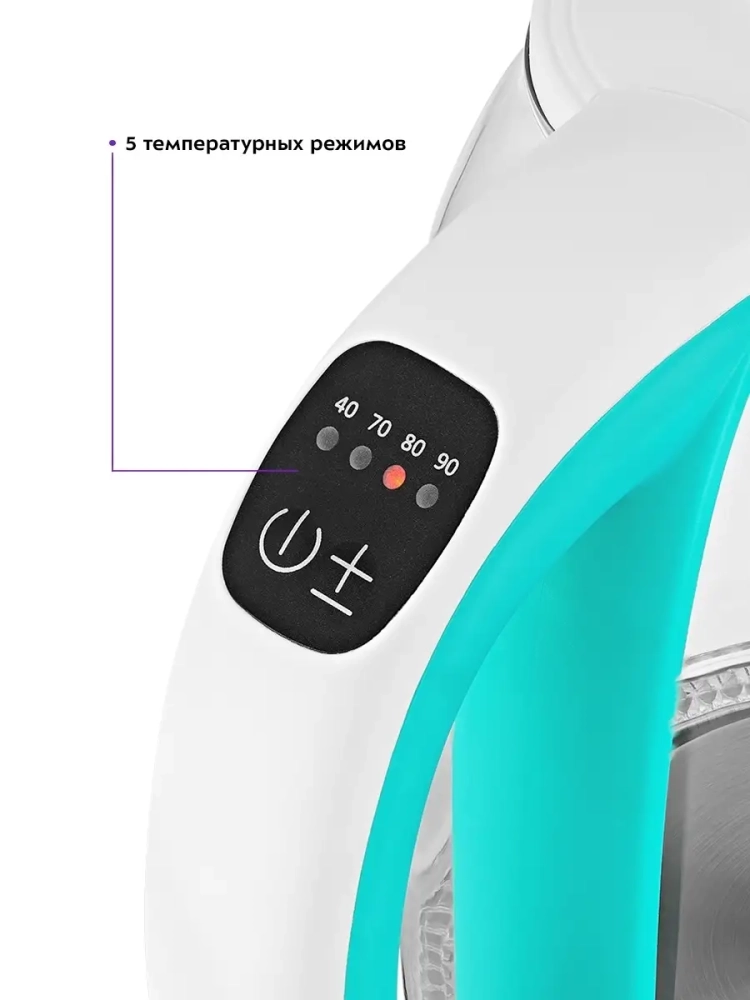 Электрический чайник с электронным терморегулятором Kitfort КТ-6140 может не только вскипятить воду, но и нагреть ее до температуры 40, 70, 80 и 90 °С, что очень удобно при заваривании различных сортов чая. Температура 40 *С пригодится для приготовления детского питания. Чайник также оснащен функцией поддержания температуры. Температура воды контролируется встроенным в дно чайника термодатчиком.