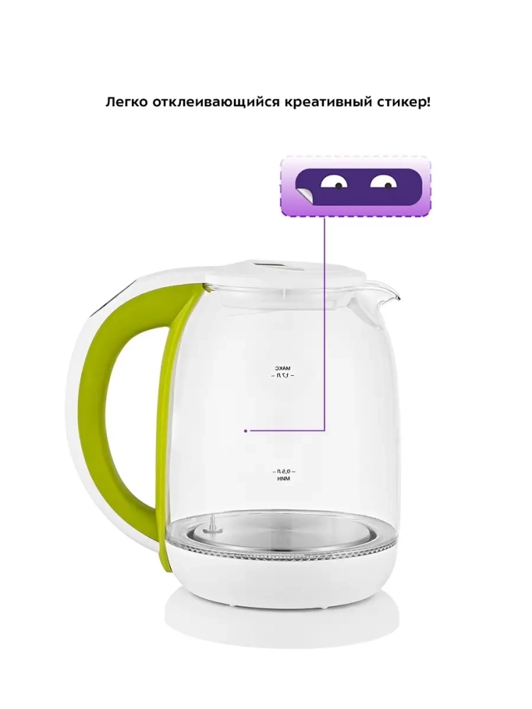 Корпус чайника выполнен из стекла, а крышка и подставка — из пластмассы. Мерная шкала нанесена на прозрачную часть корпуса. Крышка чайника открывается при нажатии на кнопку. Ручка чайника пластиковая, не нагревается и удобно лежит в руке. На ручке расположены кнопки выбора режимов работы и световые индикаторы.