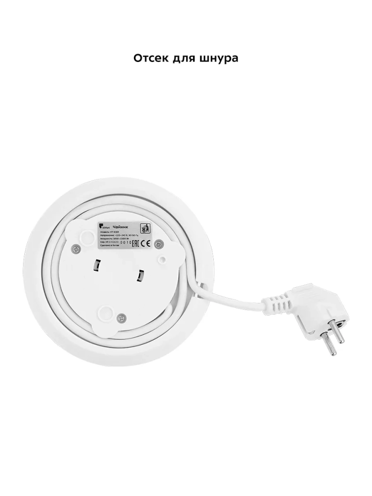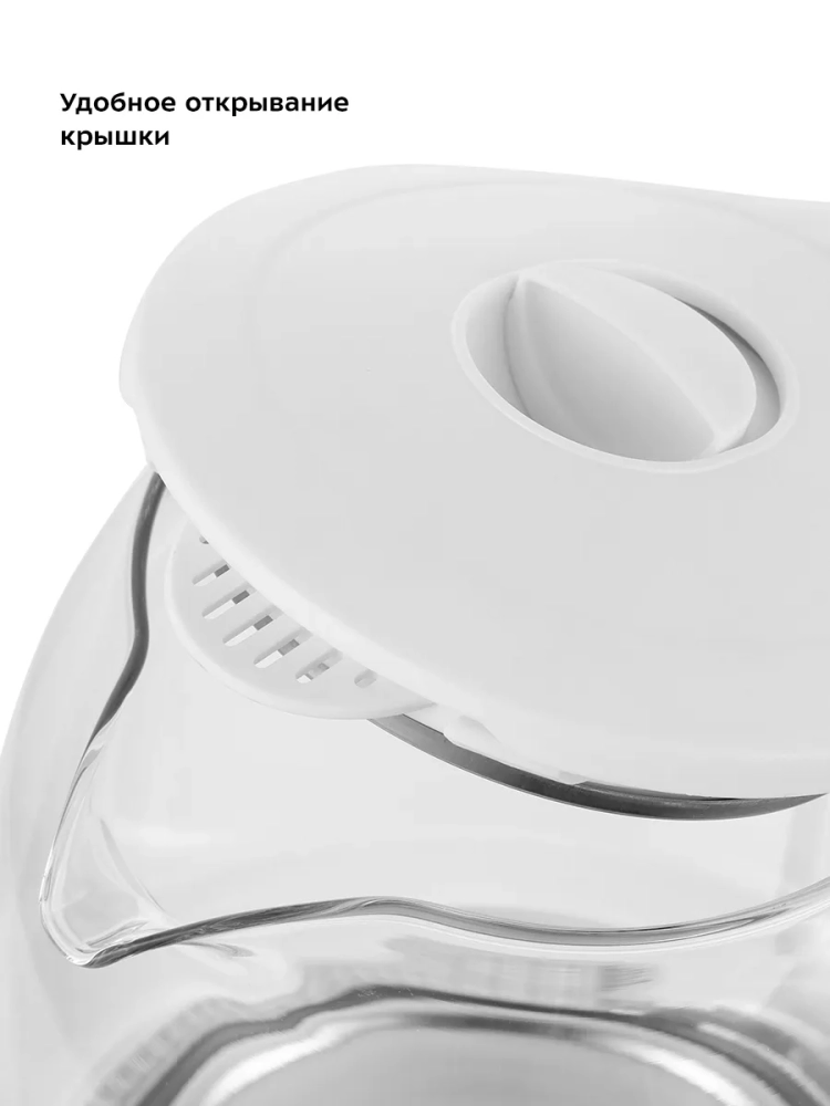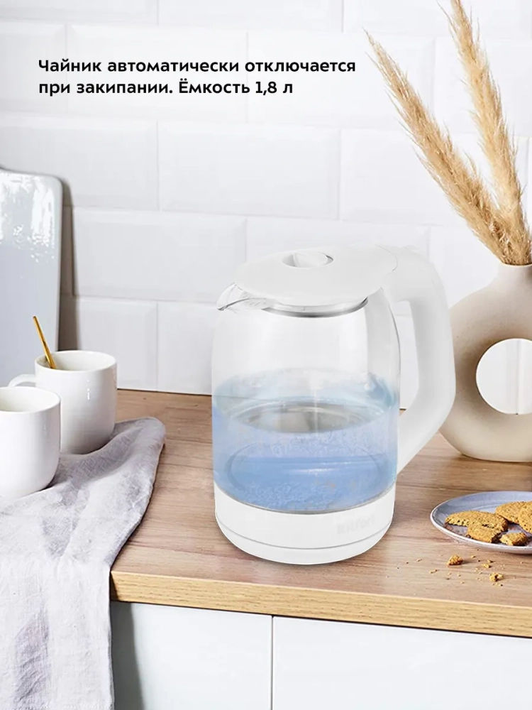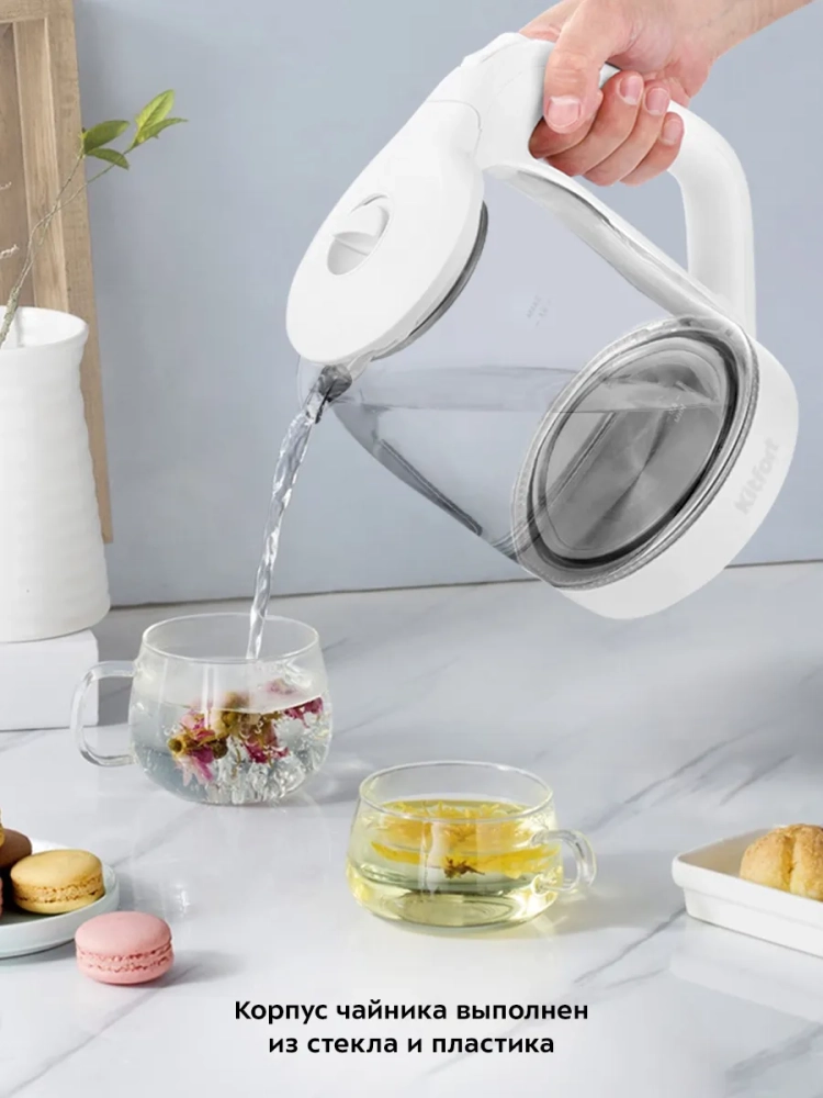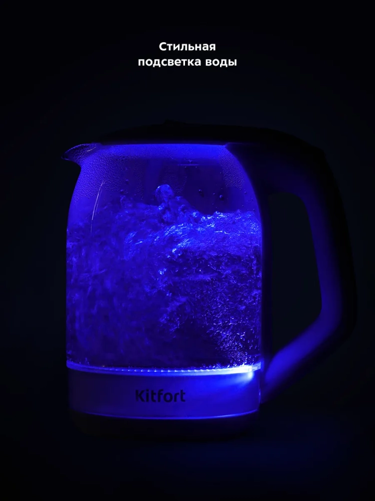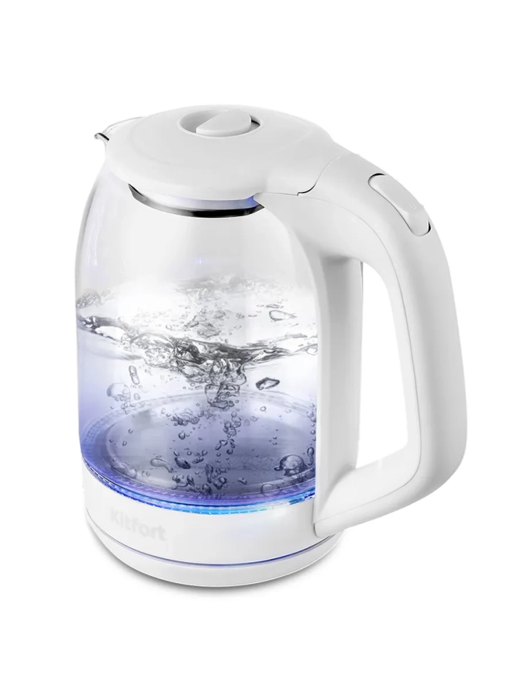 Электрический чайник Kitfort КТ-6169 предназначен для кипячения воды дома, в офисе, на даче. Корпус чайника выполнен из стекла и пластика. Крышка выполнена из сочетания пластика и металла, а подставка - из пластмассы. Мерная шкала находится на корпусе. Ручка чайника пластиковая, не нагревается и удобно лежит в руке. Внутренняя поверхность чайника состоит из стекла, благодаря чему вода не соприкасается с пластиком.Кнопка открывания крышки расположена на крышке, а кнопка включения - на ручке. При включении чайника загорается синяя подсветка, которая является индикатором работы.Нагревательный элемент (ТЭН) у этой модели чайника скрытый и находится в донной части. Сверху он закрыт специальной металлической пластиной из нержавеющей стали, благодаря которой исключается прямой контакт ТЭНа с водой. Такая конструкция препятствует образованию накипи, облегчает уход и значительно снижает шум при нагревании воды.Подставка с центральным контактом дает возможность располагать на ней чайник в любом положении, обеспечивая вращение на 360°. Снизу имеется отсек для хранения шнура, в который можно смотать излишки шнура электропитания, чтобы он не мешал на столе.Чайник автоматически отключается при закипании, имеет защиту от перегрева и от включения без воды.При закипании воды образующийся пар попадает в паропровод, проходит по нему и затем воздействует на термодатчик, который отключает чайник. Такая конструкция позволяет чайнику отключаться при закипании воды независимо от альтитуды (высоты над уровнем моря). Как известно, атмосферное давление уменьшается с увеличением высоты над уровнем моря, а температура кипения воды, в свою очередь, зависит от давления, так что высоко в горах вода может закипать уже при 80 °С. Таким образом, контроллер выключает чайник не при какой-то определенной температуре, а именно при закипании воды, независимо от того, при какой температуре она закипает.