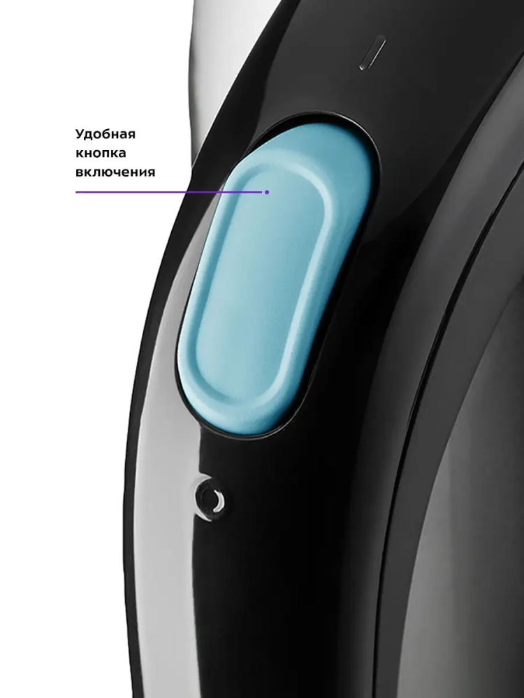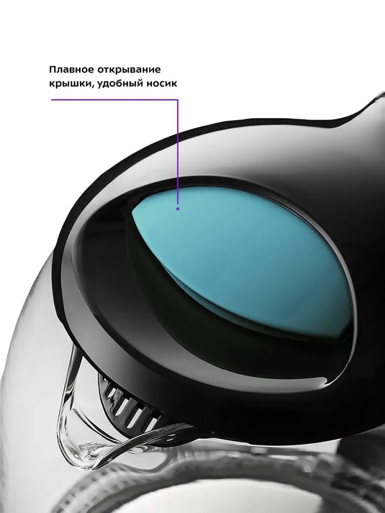 Кнопка открывания крышки расположена сверху на крышке, а кнопка включения — на ручке. При включении чайника загорается синяя подсветка, которая является индикатором работы и одновременно художественно подсвечивает кипящую воду.