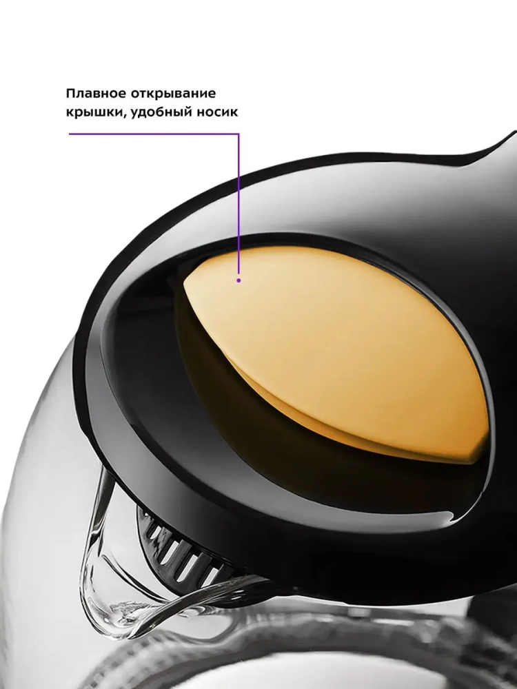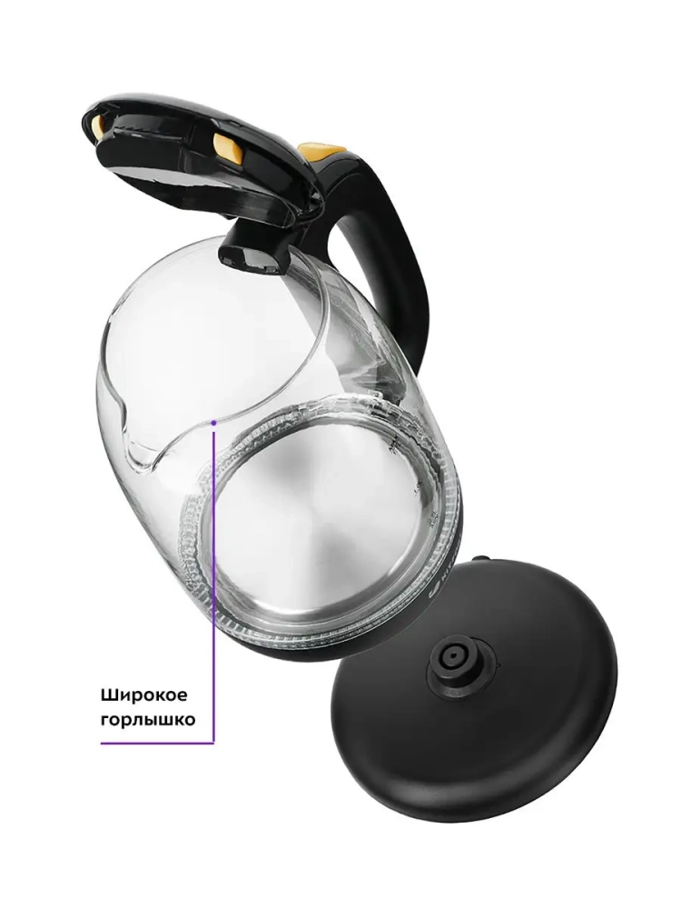 Корпус чайника выполнен из стекла, а крышка и подставка — из пластмассы. Мерная шкала нанесена на прозрачную часть корпуса. Большое горлышко чайника облегчает доступ внутрь при мытье и во время удаления накипи. Ручка чайника пластиковая, не нагревается и удобно лежит в руке.