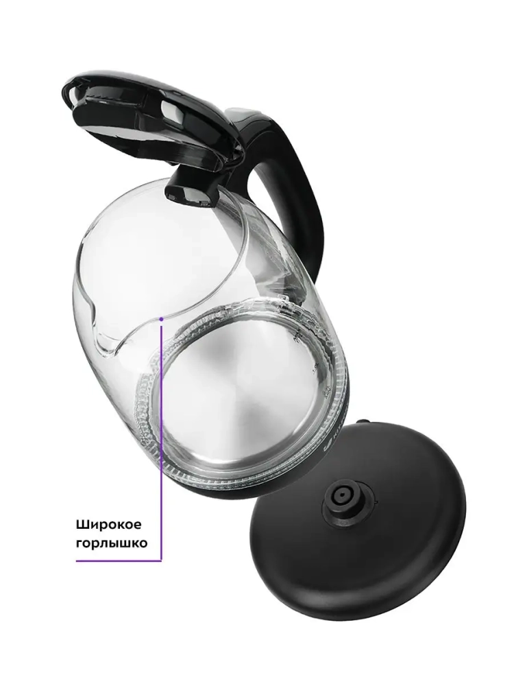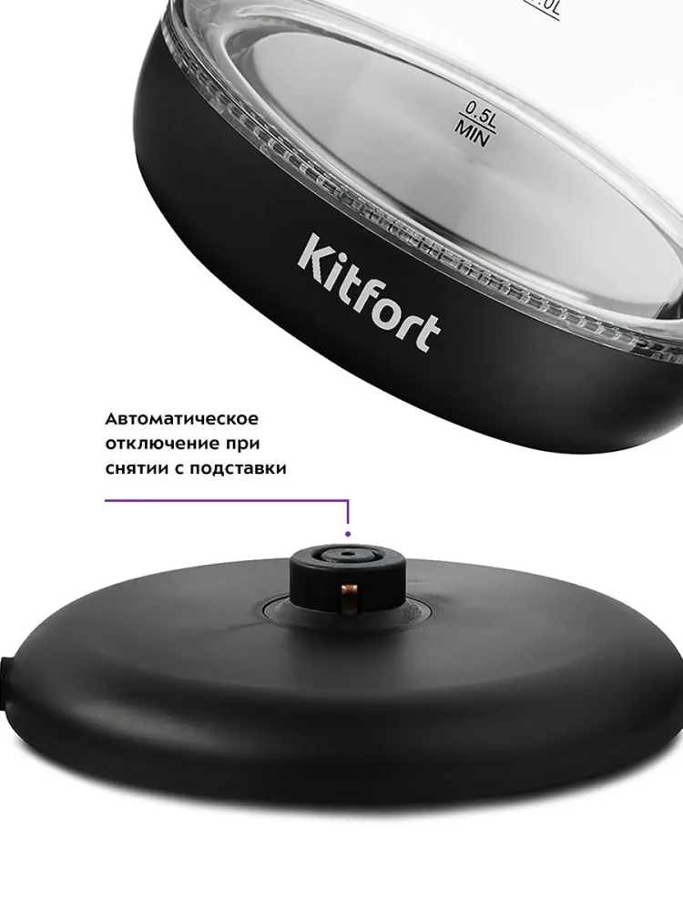 Электрический чайник Kitfort КТ-625 предназначен для кипячения воды дома, в офисах и на дачах. Мощность чайника позволяет использовать его в домах со слабой проводкой. Корпус чайника выполнен из стекла, а крышка и подставка — из пластмассы. Мерная шкала нанесена на прозрачную часть корпуса. Большое горлышко чайника облегчает доступ внутрь при мытье и во время удаления накипи. Ручка чайника пластиковая, не нагревается и удобно лежит в руке. Кнопка открывания крышки расположена сверху на крышке, а кнопка включения — на ручке. При включении чайника загорается синяя подсветка, которая является индикатором работы и одновременно художественно подсвечивает кипящую воду. Нагревательный элемент (ТЭН) у этой модели чайника скрытый и находится в донной части. Сверху он закрыт специальной металлической пластиной из нержавеющей стали, благодаря которой исключается прямой контакт ТЭНа с водой. Такая конструкция препятствует образованию накипи, облегчает уход и значительно снижает шум при нагревании воды. Подставка с центральным контактом дает возможность располагать на ней чайник на нее в любом положении, обеспечивая вращение на 360°. Снизу имеется отсек для хранения шнура, в который можно смотать излишки шнура электропитания, чтобы он не мешался на столе. Чайник Китфорт КТ-625 автоматически отключается при закипании и при снятии с подставки, имеет защиту от перегрева и от включения без воды.