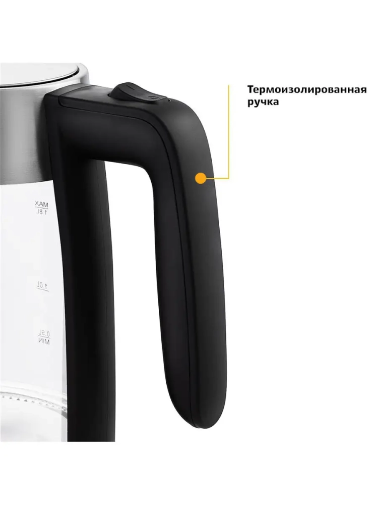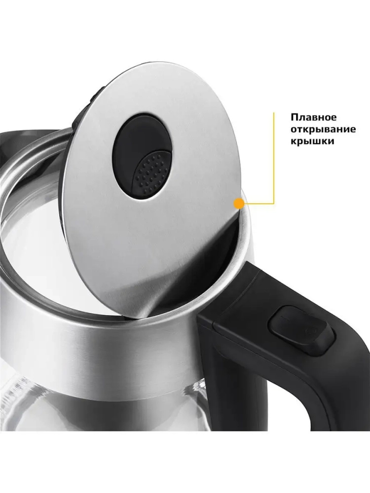 Корпус чайника выполнен из стекла, а крышка и подставка — из сочетания пластика и металла. Мерная шкала нанесена на прозрачную часть корпуса. Большое горлышко чайника облегчает доступ внутрь при мытье и во время удаления накипи. Ручка чайника пластиковая, не нагревается и удобно лежит в руке.