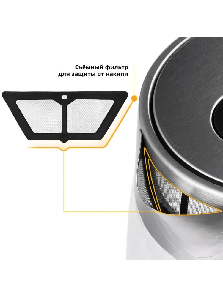 Нагревательный элемент (ТЭН) у этой модели чайника скрытый и находится в донной части. Сверху он закрыт специальной металлической пластиной из нержавеющей стали, благодаря которой исключается прямой контакт ТЭНа с водой. Такая конструкция препятствует образованию накипи, облегчает уход и значительно снижает шум при нагревании воды.