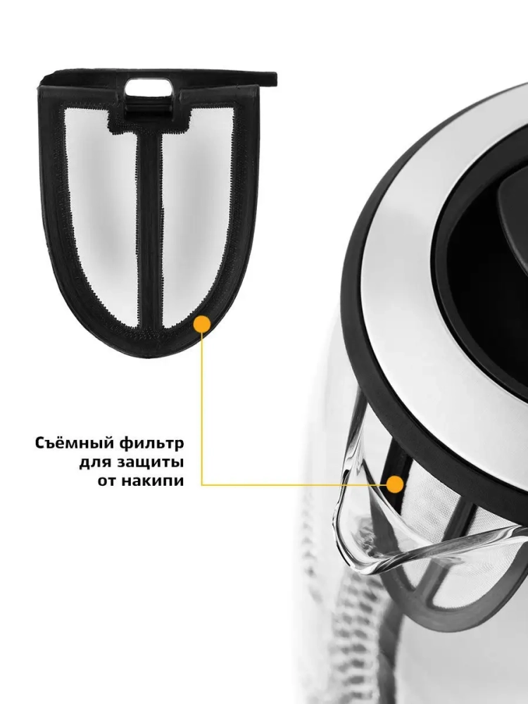 Корпус чайника выполнен из стекла, а крышка и подставка — из пластмассы. Мерная шкала нанесена на прозрачную часть корпуса. Большое горлышко чайника облегчает доступ внутрь при мытье и во время удаления накипи. Ручка чайника пластиковая, не нагревается и удобно лежит в руке.