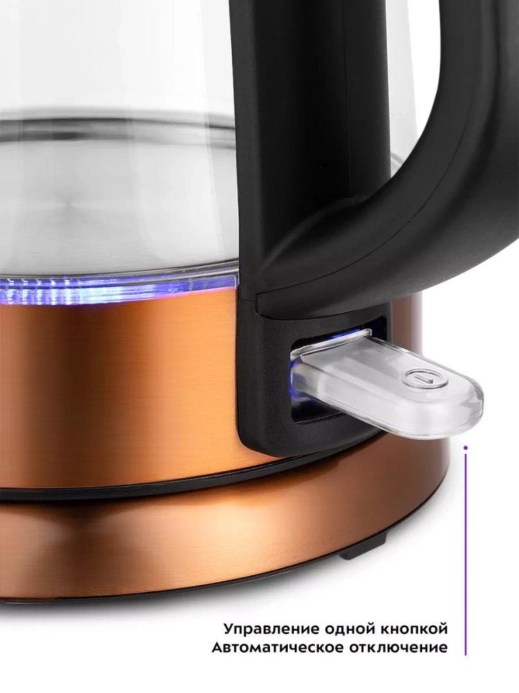 Кнопка открывания крышки расположена сверху на ручке, а кнопка включения — внизу. При включении чайника загорается синяя подсветка, которая является индикатором работы и одновременно художественно подсвечивает кипящую воду.