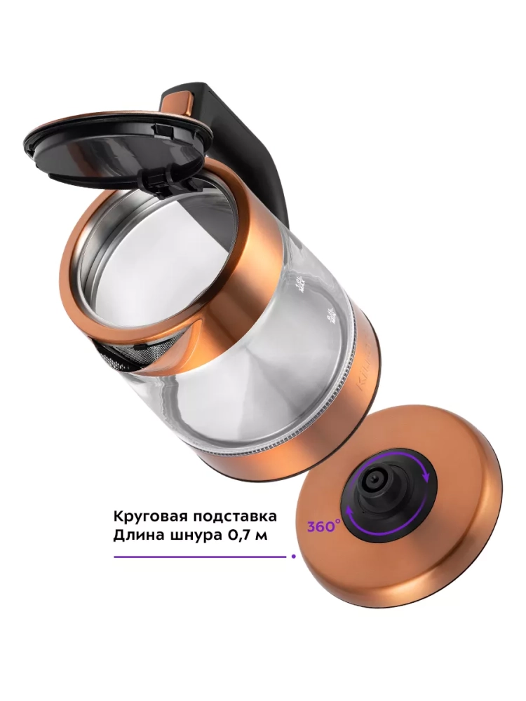 Подставка с центральным контактом дает возможность ставить чайник на нее в любом положении, обеспечивая вращение на 360°. Ножки подставки противоскользящие.