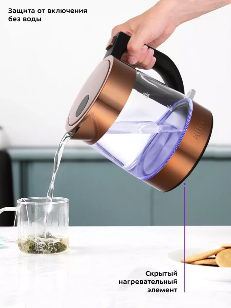 Чайник автоматически отключается при закипании и при снятии с подставки, имеет защиту от перегрева и от включения без воды.