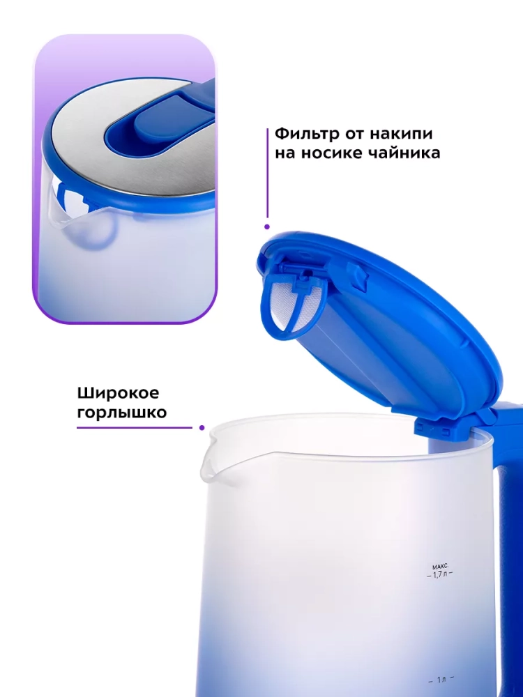 Чайник автоматически отключается при закипании, имеет защиту от перегрева и от включения без воды.