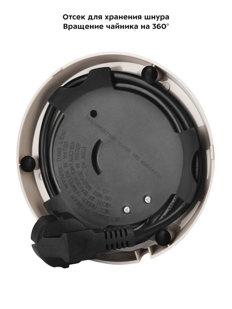 Подставка с центральным контактом дает возможность располагать на ней чайник в любом положении, обеспечивая вращение на 360°. Снизу имеется отсек для хранения шнура, в который можно смотать излишки шнура электропитания, чтобы он не мешал на столе.