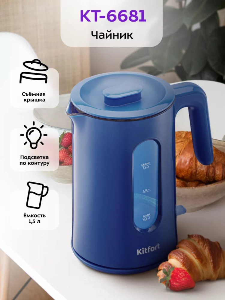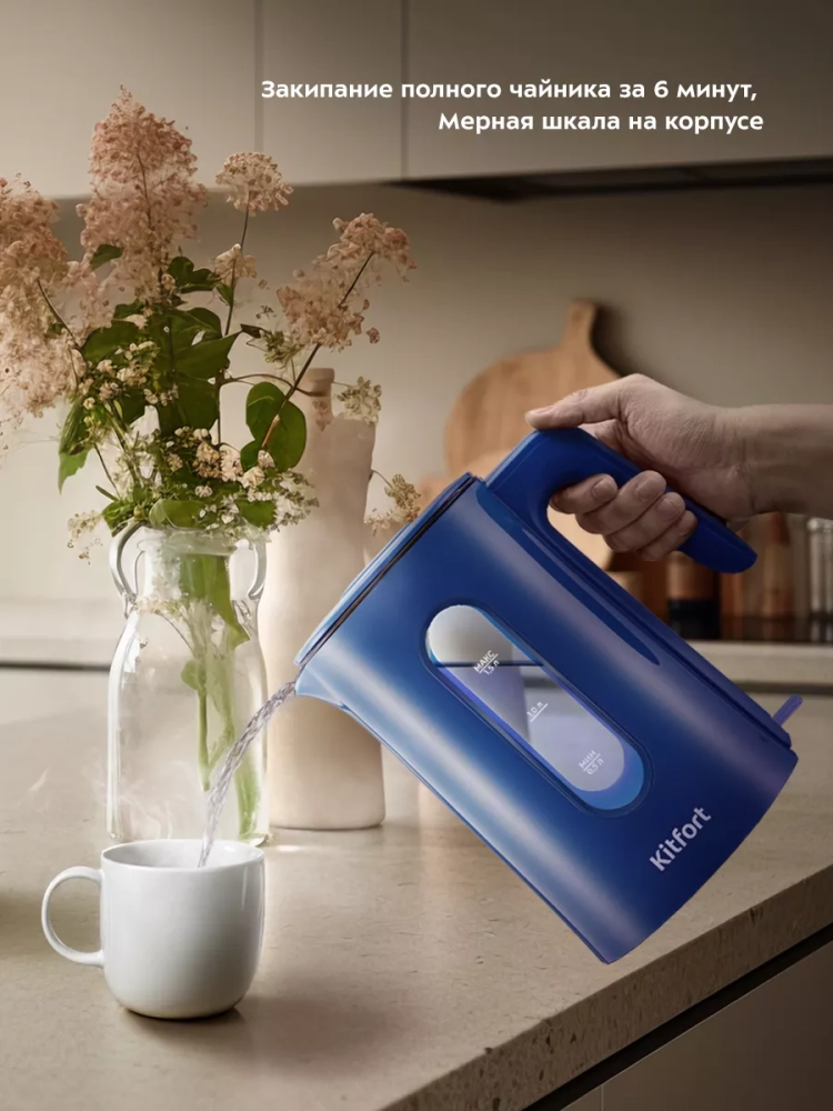 Электрический чайник Kitfort КТ-6681 предназначен для кипячения воды дома, в офисе, на даче. Полный чайник закипает примерно за 6 минут.