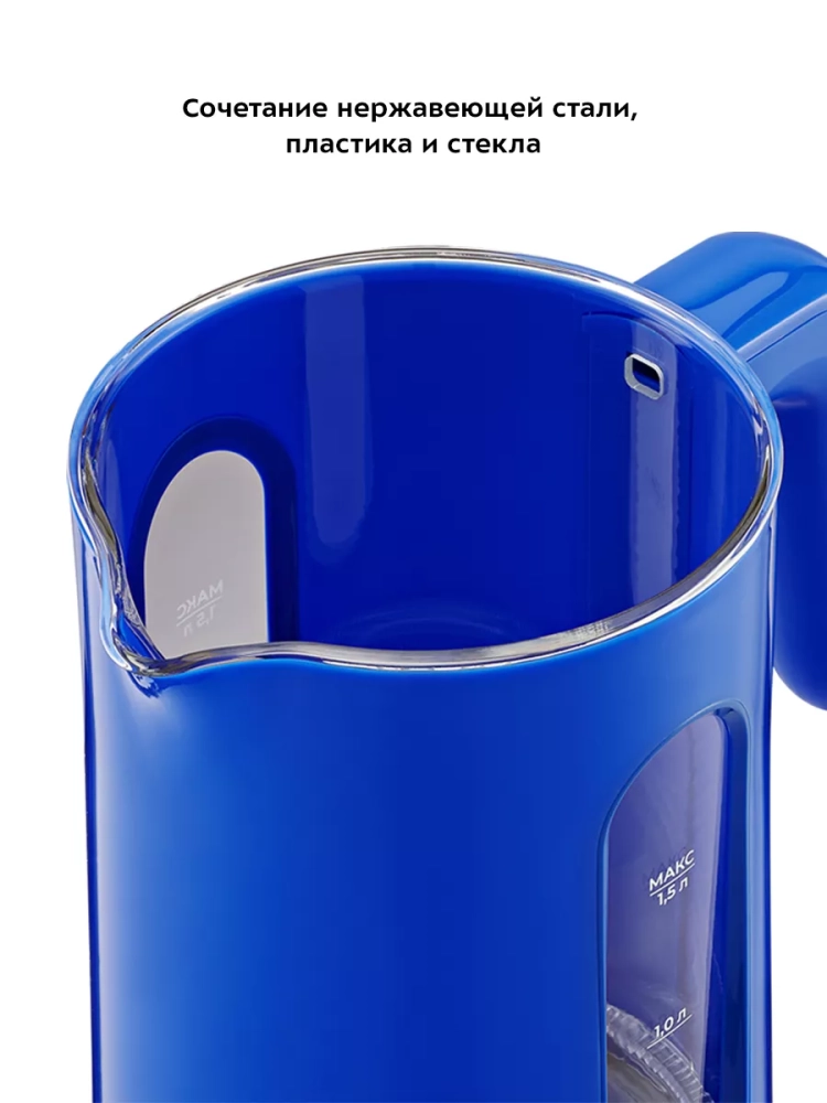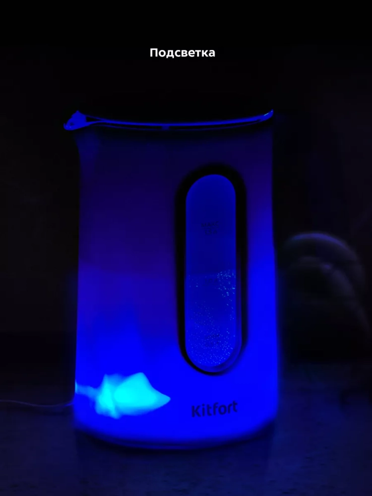 При включении чайника загорается подсветка, которая является индикатором работы и одновременно подсвечивает воду в приборе.
