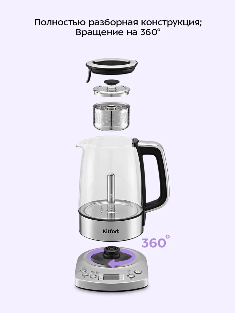 Подставка с центральным контактом дает возможность располагать на ней чайник в любом положении, обеспечивая вращение на 360°.
