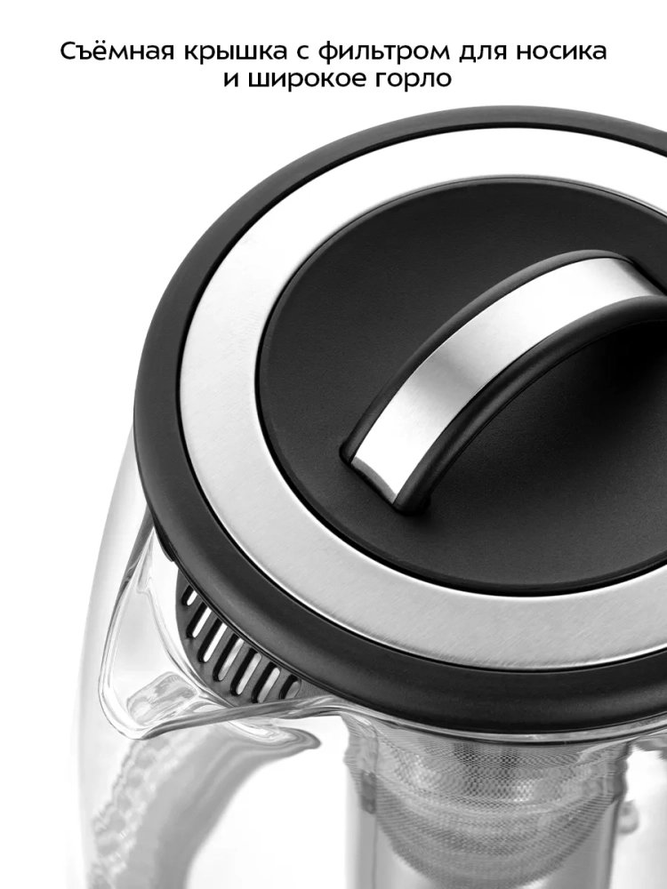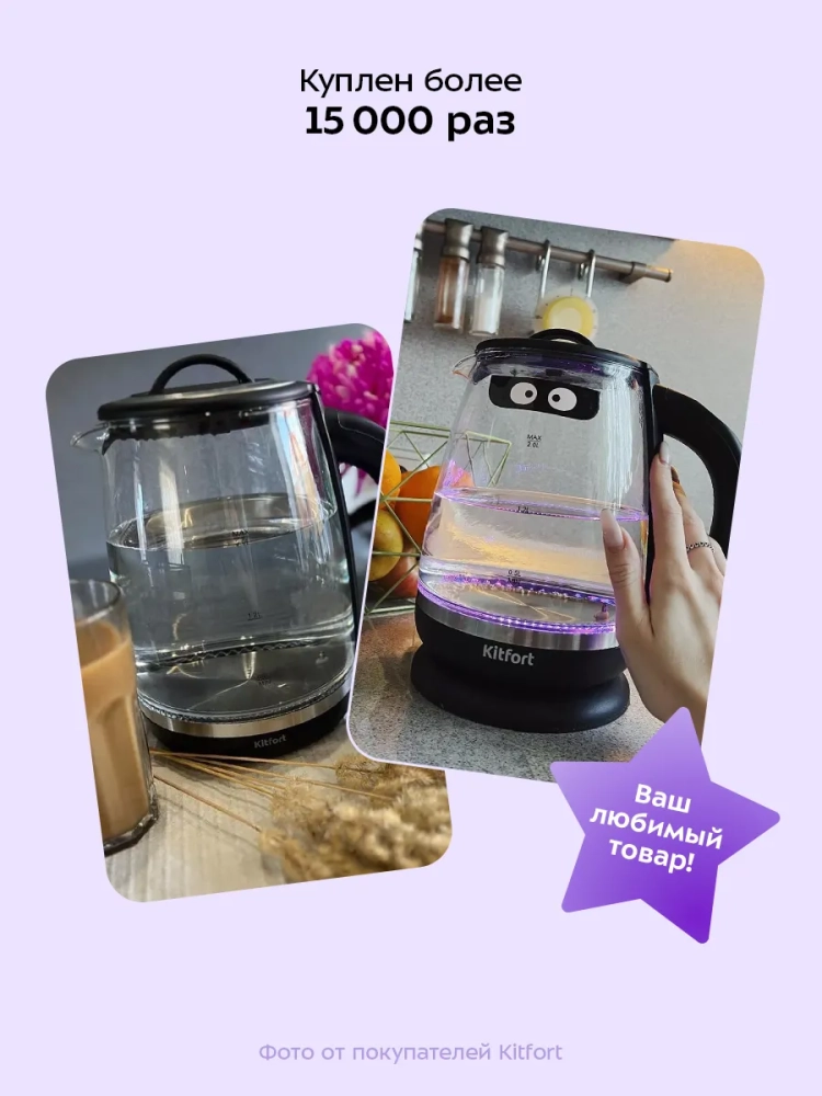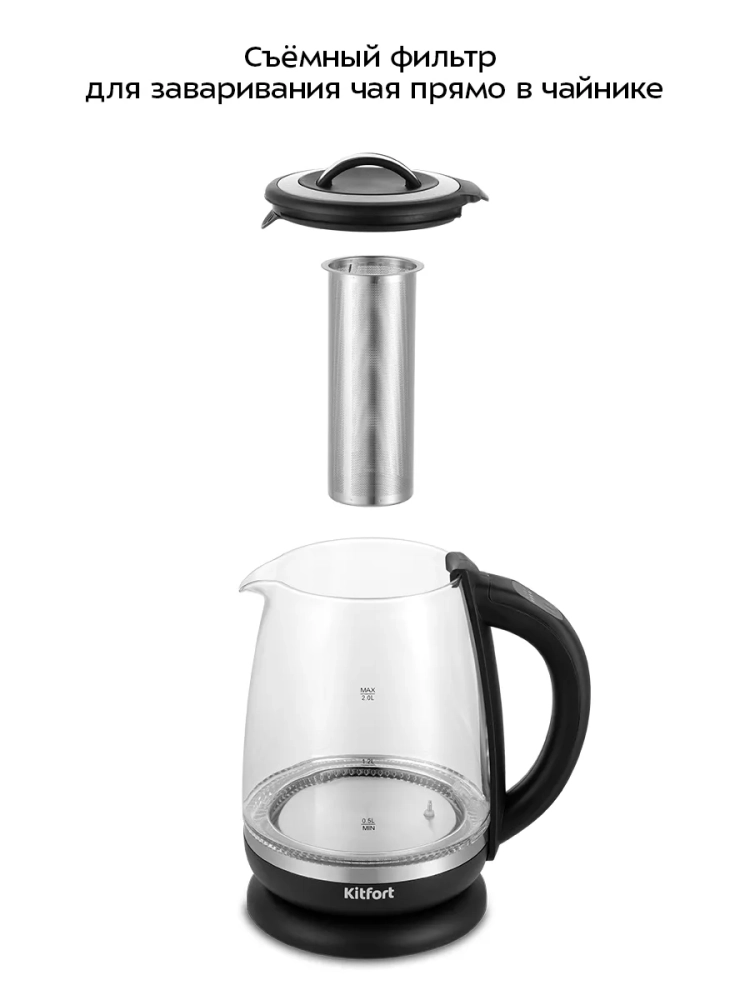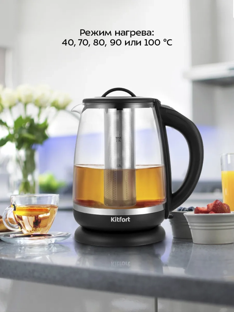 Электрический чайник с электронным терморегулятором Kitfort КТ-6145 может не только вскипятить воду, но и нагреть ее до температур: 40, 70, 80, 90 и 100 °С, что очень удобно при заваривании различных сортов чая. Чайник также оснащен функцией поддержания температуры. В чайнике КТ-6145 есть встроенный фильтр для заваривания чая, а также предустановлены температуры заваривания для популярных сортов чая. Вам нужно только засыпать чайные листья в корзину, залить воду и выбрать необходимую температуру. Корпус чайника выполнен из стекла и пластика, подставка - из пластика, а крышка - из сочетания пластмассы и нержавеющей стали. Мерная шкала нанесена на прозрачную часть корпуса. Съемная крышка и большое горлышко чайника облегчают доступ внутрь при его чистки и во время удаления накипи. Ручка чайника пластиковая, не нагревается и удобно лежит в руке. На ручке расположена панель управления чайником. Подставка с центральным контактом дает возможность располагать на ней чайник в любом положении, обеспечивая вращение на 360°. Снизу имеется отсек для хранения шнура, в который можно убрать излишки шнура электропитания, чтобы он не мешал. После закипания, выбора и окончания программ, а также при установке чайника с подставки раздается звуковой сигнал. Полный чайник закипает за 6 минут. При закипании чайник автоматически отключится. Прибор имеет защиту от перегрева и от включения без воды: при включении без воды чайник нагревается и отключается (срабатывает защита от перегрева).
