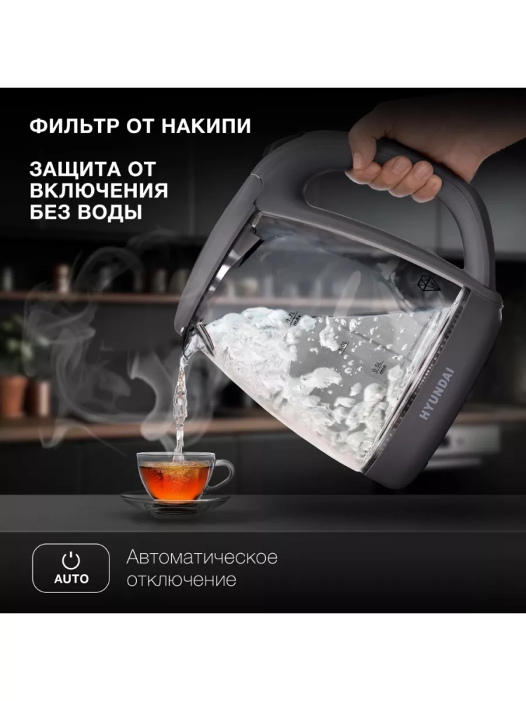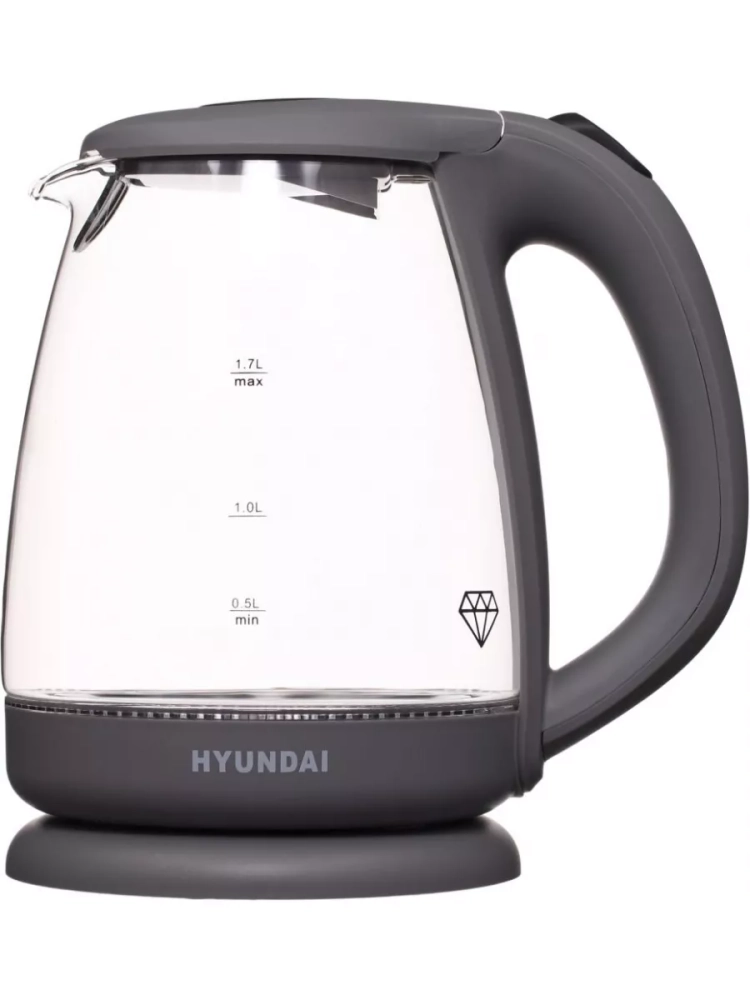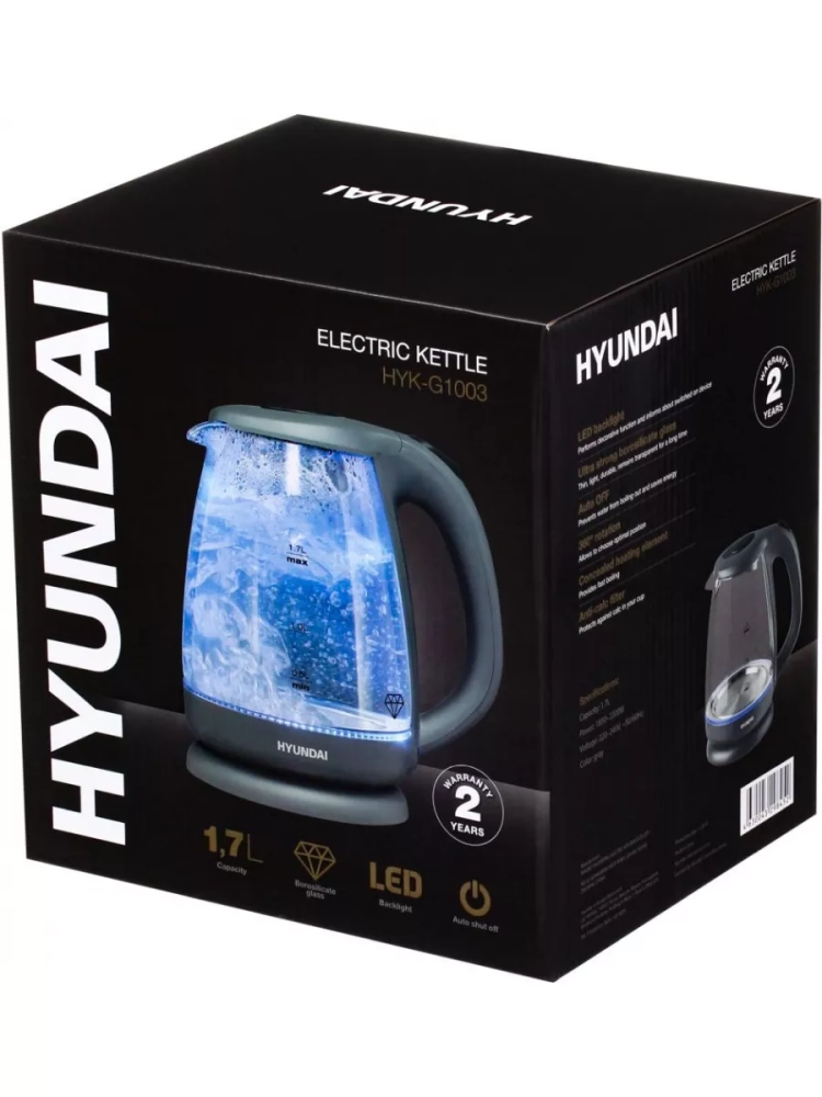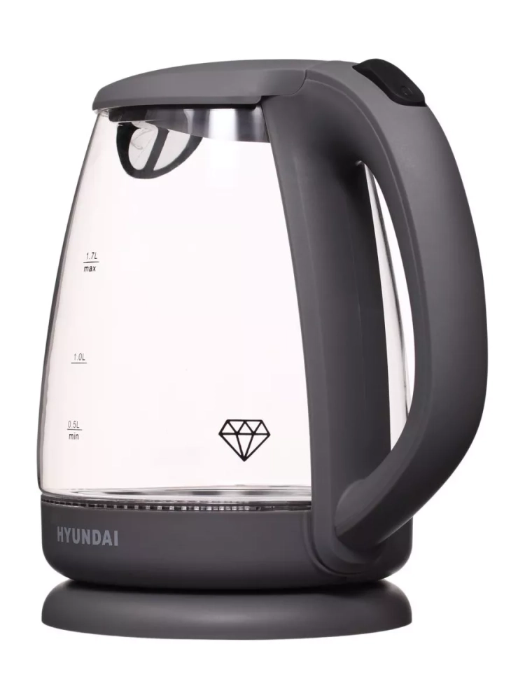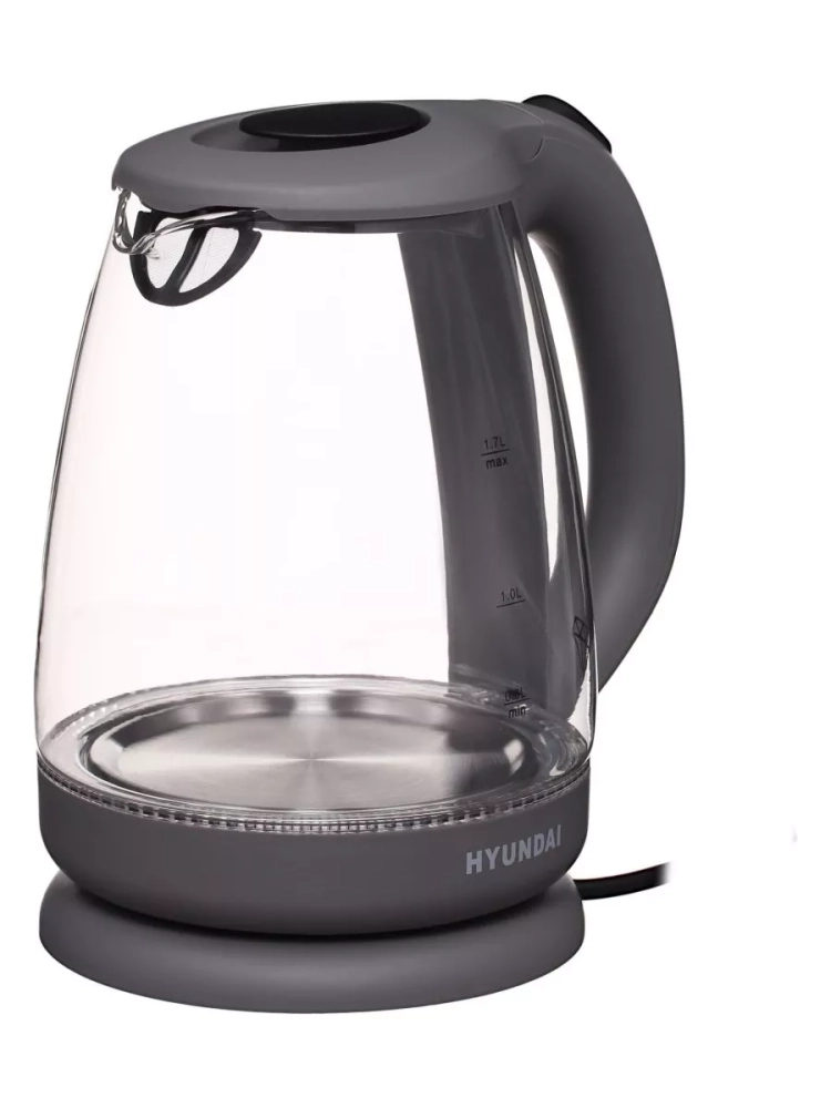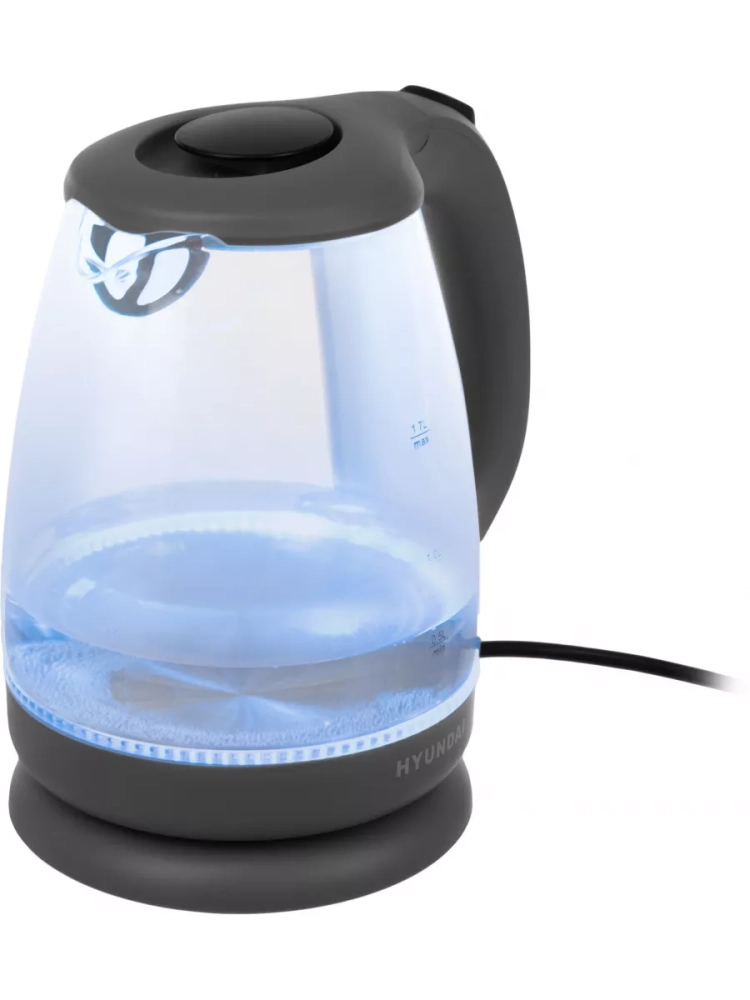Чайник электрический Hyundai HYK-G1003 серый, объём 1.7л, мощность 2200Вт, материал корпуса: стекло/пластик. В чайнике используется высококачественное боросиликатное стекло, легкое, прочное, не темнеет и не окрашивается со временем. Красивая голубая LED подсветка украшает процесс закипания и оповещает о включении прибора. 2 года гарантии.