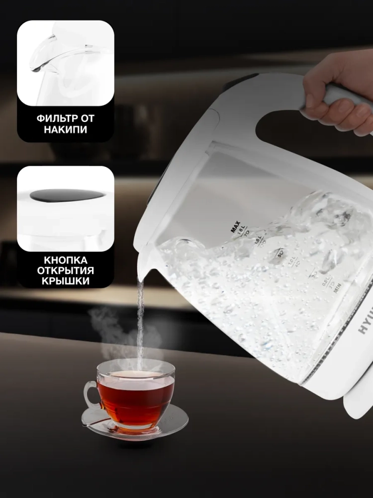 Чайник электрический Hyundai HYK-G2001 белый/серый, объём 1.8л, мощность 2200Вт, материал корпуса: стекло/пластик