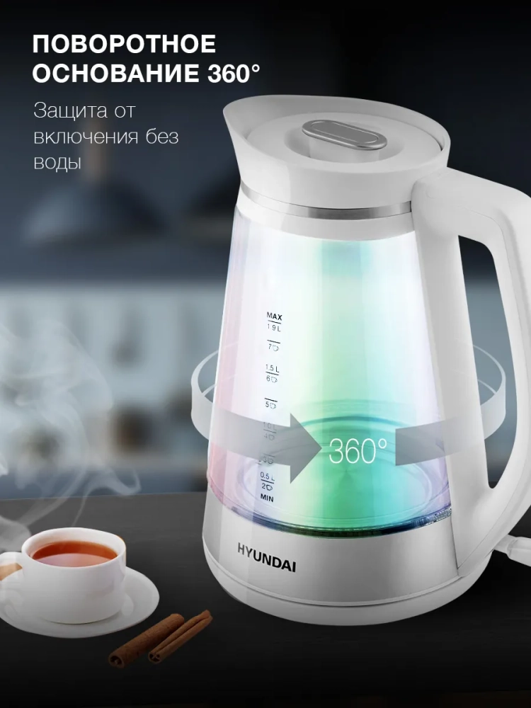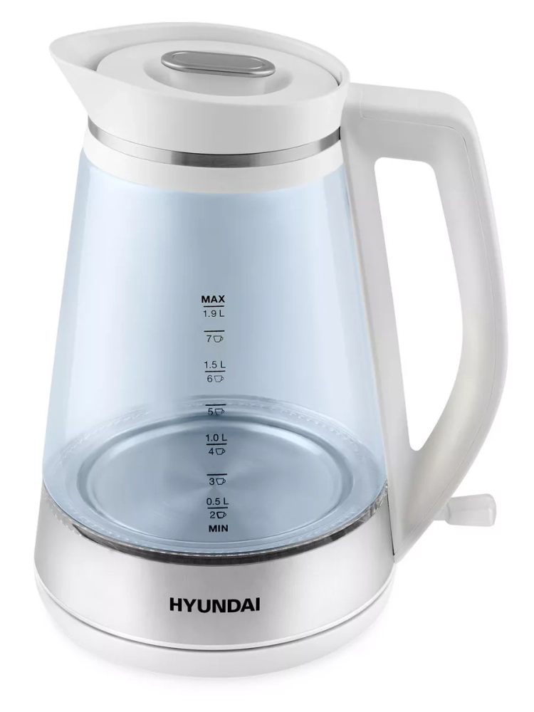 Под эргономичной рукоятью чайника располагается клавиша включения и яркий световой индикатор его работы. Жидкость во время нагрева также подсвечивается. В конце цикла Hyundai HYK-G3037 выключается автоматически. Без воды прибор и вовсе включиться не может, для этого в нём установлена соответствующая система.