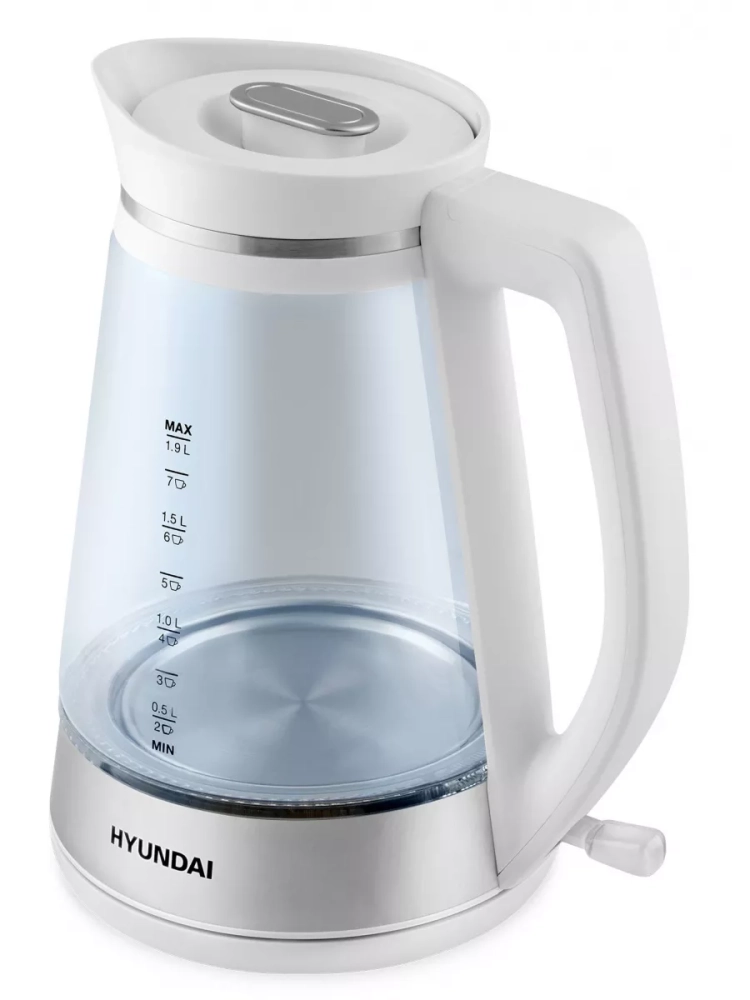 Мощность прибора составляет 3000 Вт. Этого вполне достаточно, чтобы за считанные минуты довести 1,9 л помещающейся в нём жидкости до состояния кипения. Стенки данной модели сделаны из стекла, которое обеспечивает долгое сохранение температуры, а специальный пластик, ставший основным материалом крышки, рукояти и нижней части, обеспечивает лёгкость и прочность девайса, а также не выделяет вредных примесей при нагреве. Полупрозрачные боковые стенки Hyundai HYK-G3037 размечены рисками с указанием объёма налитой воды. Измерение приведено в литрах и чашках.