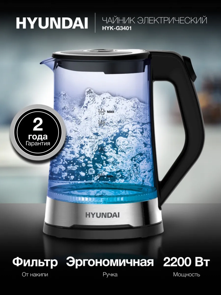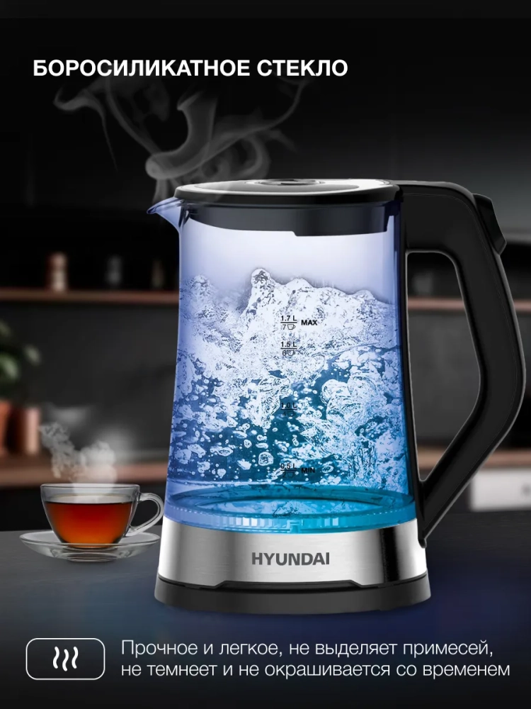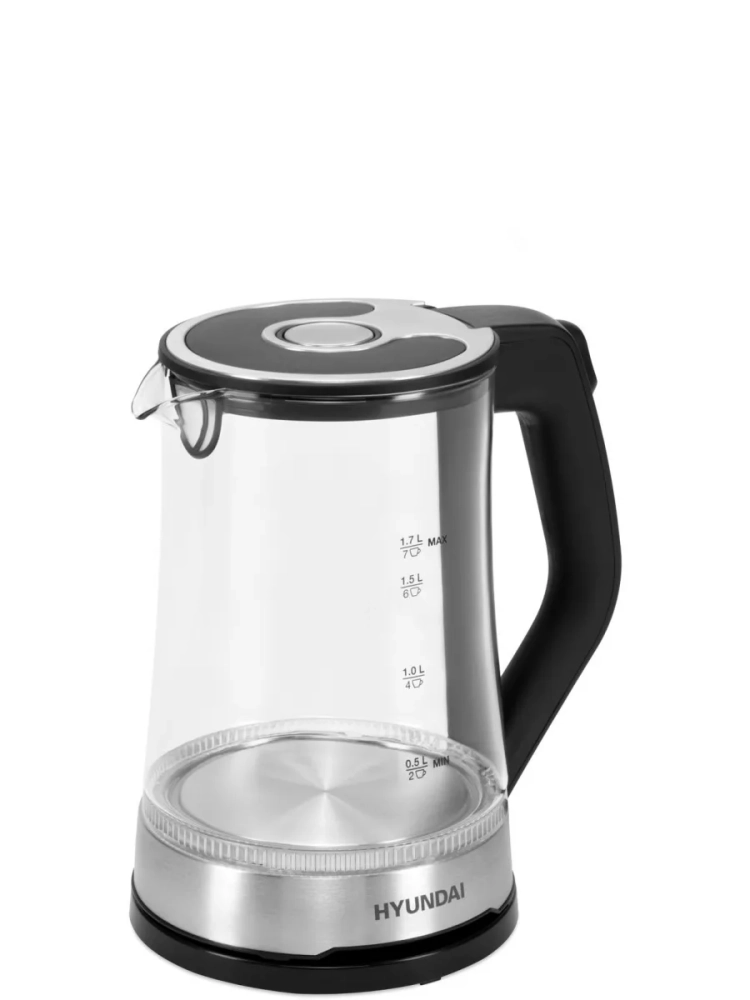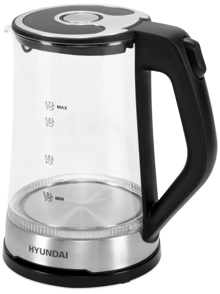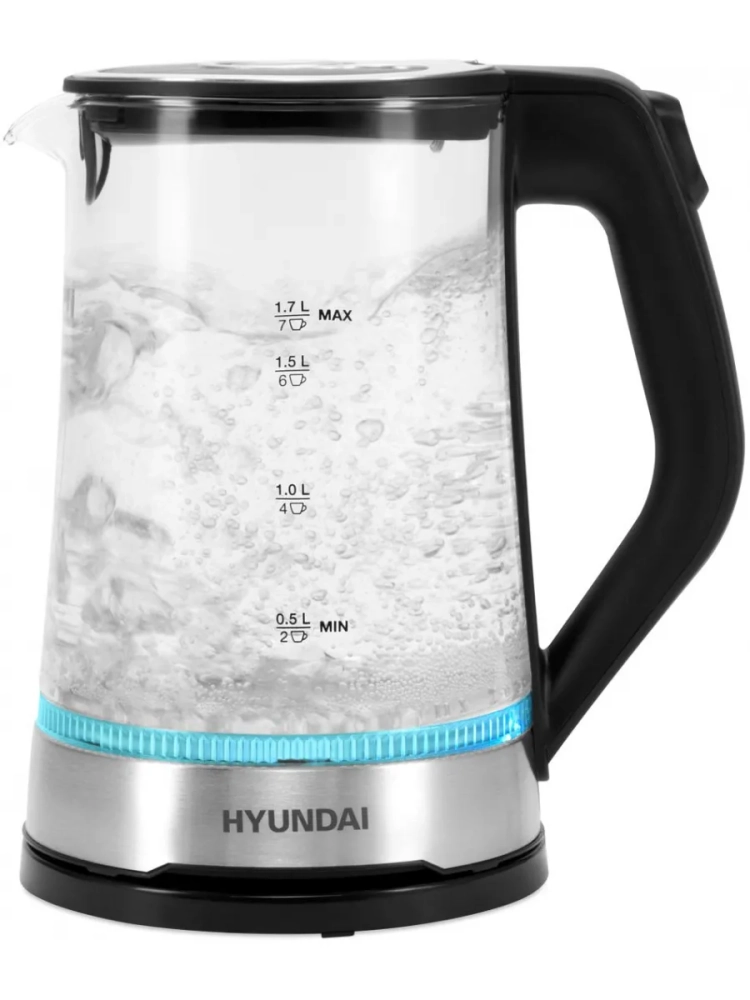 Стеклянный электрический чайник с подсветкой Hyundai HYK-G3401 позволит вскипятить воду для заваривания чая или приготовить до 7 порций горячего напитка. Специальные метки на корпусе позволят точно рассчитать необходимый для этого объем, а благодаря встроенному в крышку фильтру от накипи посторонние включения не окажутся в чашках.