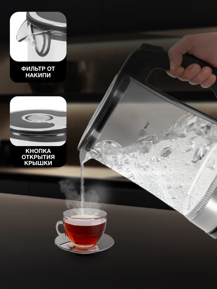Стеклянная колба. Стекло химически нейтрально и не образует вредных веществ при нагреве, а благодаря прозрачным стенкам легко контролировать количество оставшейся воды. Форма носика исключает разбрызгивание при наливании.