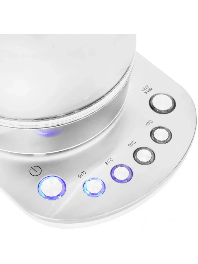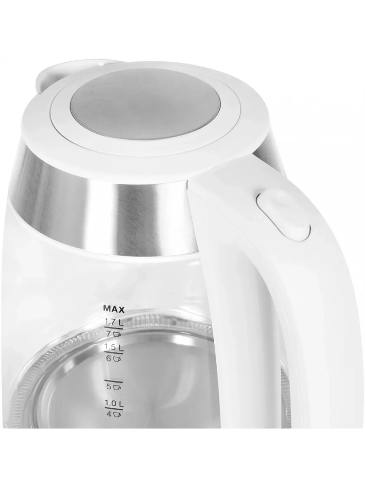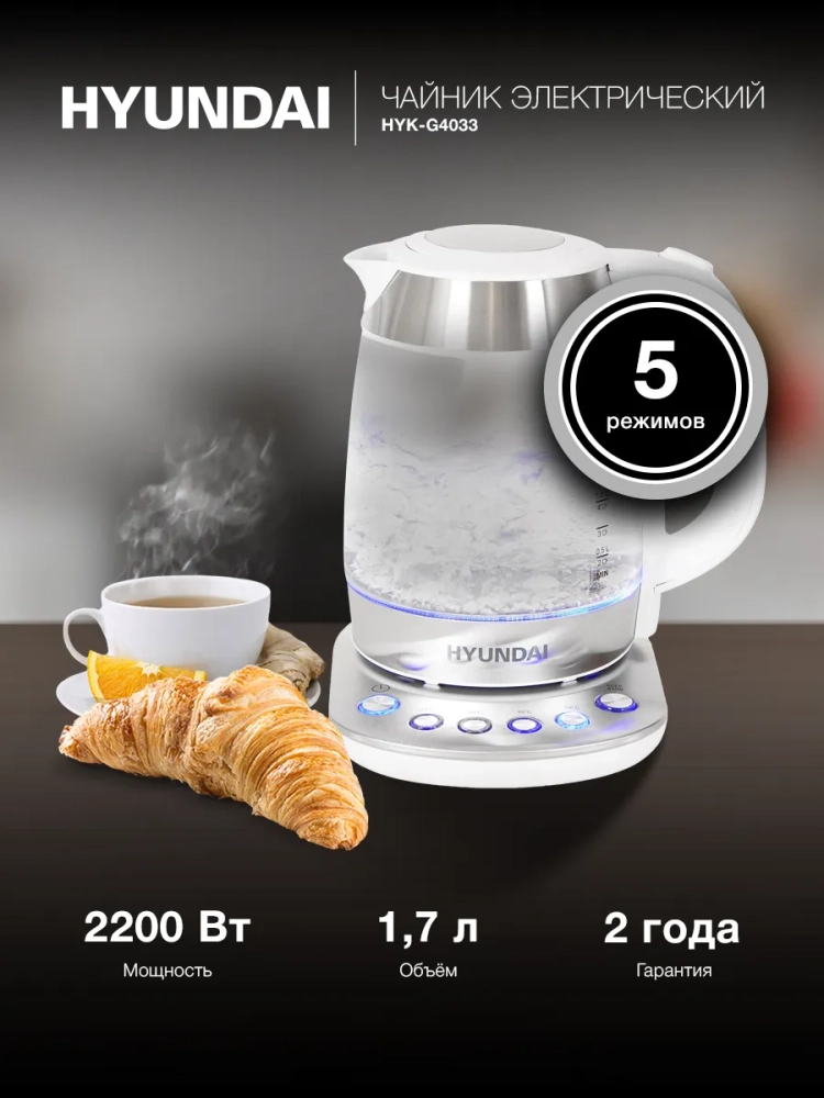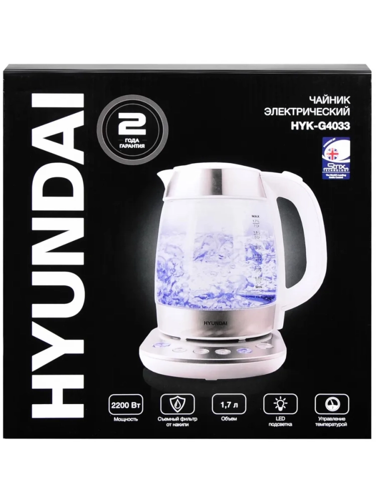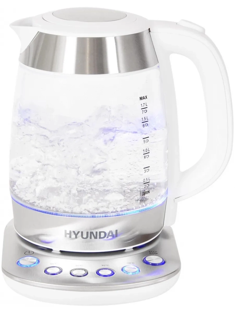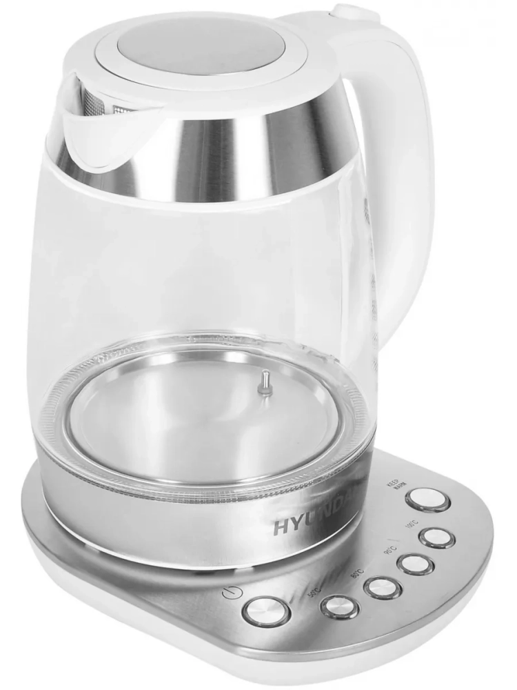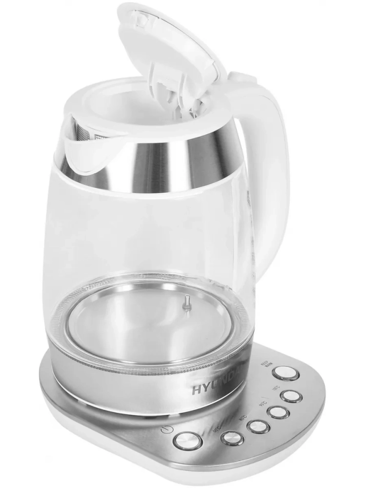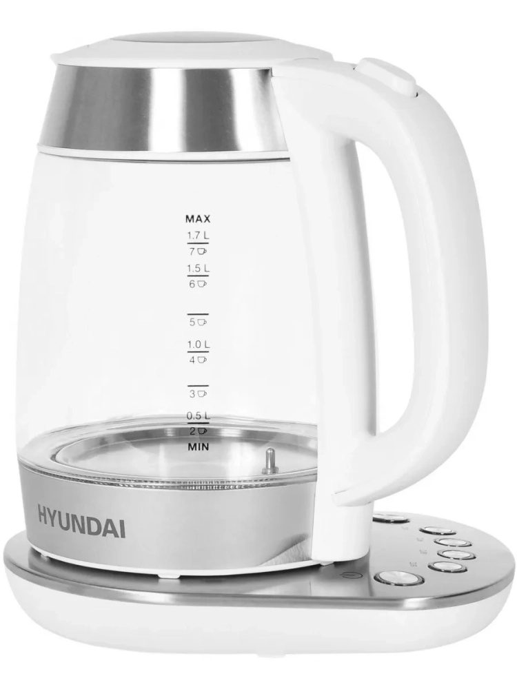 Чайник электрический Hyundai HYK-G4033 белый/серебристый, объём 1.7л, мощность 2200Вт, материал корпуса: стекло