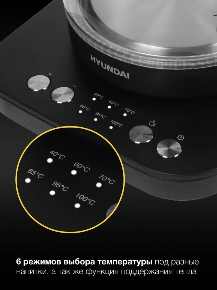 Электрический чайник Hyundai HYK-G5506 — это продуманное решение для кухни, где ценят удобство, стиль и точный контроль температуры. Модель оснащена сразу шестью температурными режимами: 40, 60, 70, 85, 95 и 100 градусов — для заваривания разных видов чая, кофе, детских смесей и других напитков. Благодаря функции поддержания температуры вода останется теплой столько, сколько нужно, без повторного кипячения.