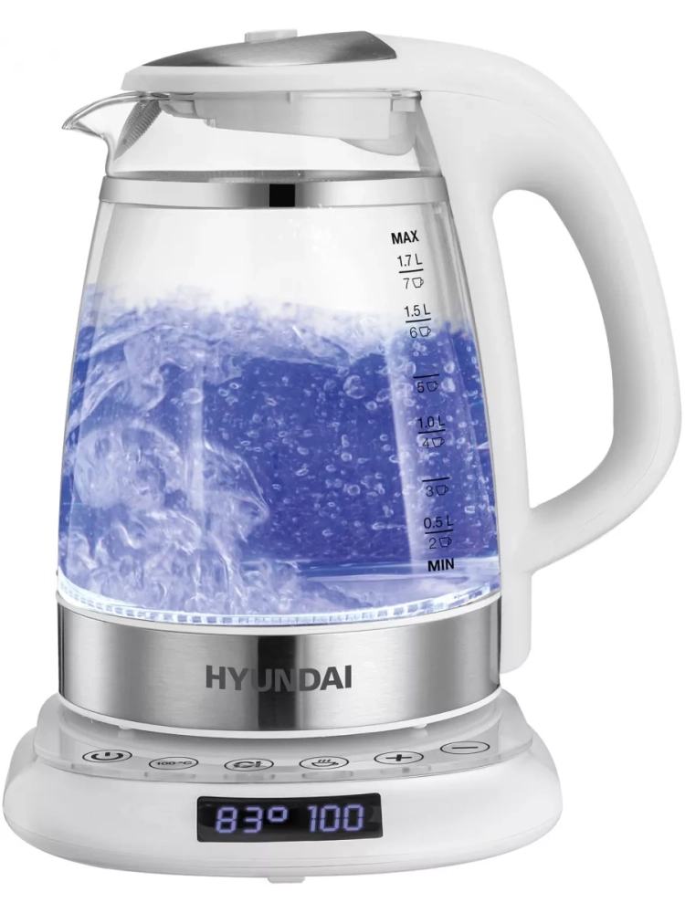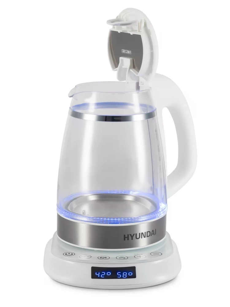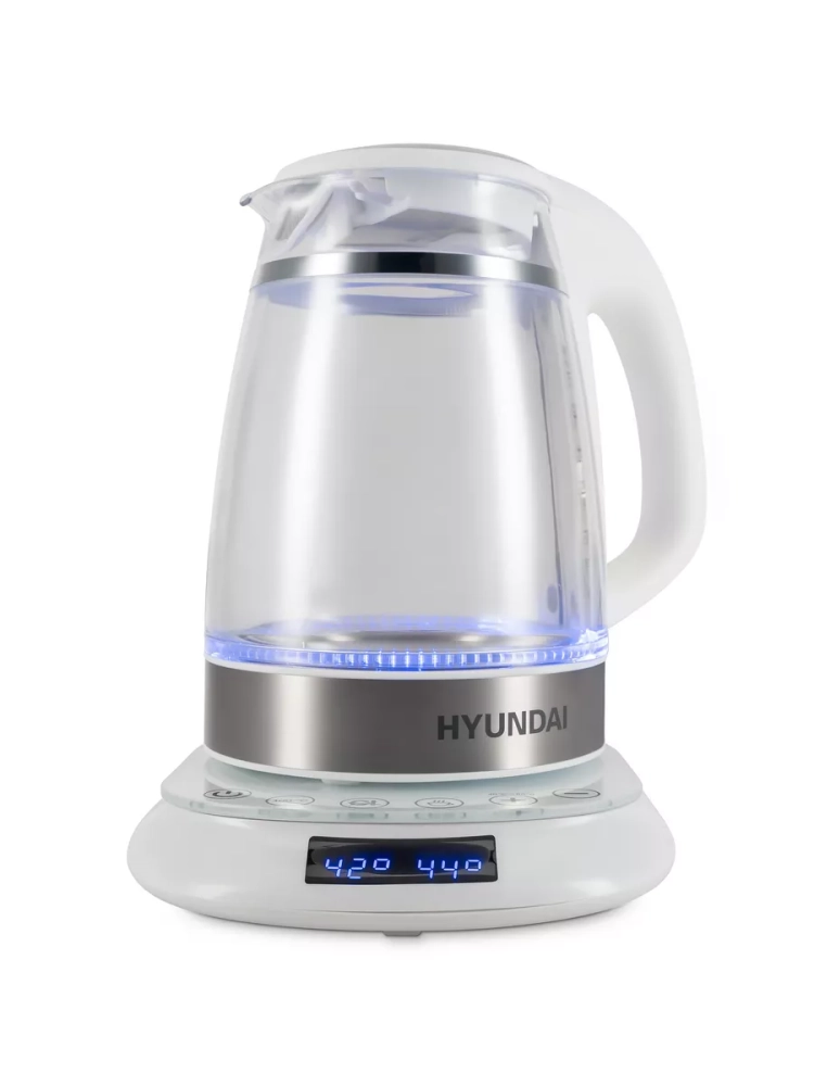 Чайник электрический Hyundai HYK-G5507 белый/серебристый, объём 1.7л, мощность 2200Вт, материал корпуса: стекло. Двойной теплоизолированный корпус. Внешний корпус из прозрачного пластика, защищает от случайного ожога при прикосновении. Внутренний корпус из боросиликатного стекла, не впитывает и не выделяет примесей, не темнеет и не окрашивается со временем. Электрический чайник с двойными стенками на базе, для быстрого приготовления теплой и горячей воды нужной температуры под разные цели. Это не просто чайник, а современный, безопасный и качественный инструмент на вашей кухне под разные задачи. Информационный дисплей, сенсорное управление установками температуры 40-100С и функцией поддержания, для любых напитков и бытовых нужд.