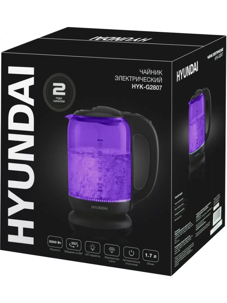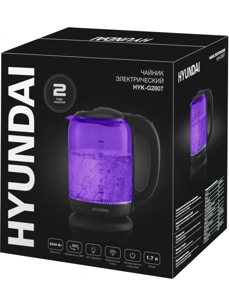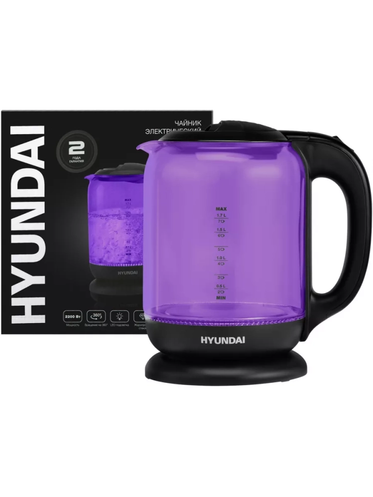Чайник электрический Hyundai HYK-G5809 фиолетовый/черный, объём 1.7л, мощность 2200Вт, материал корпуса: стекло