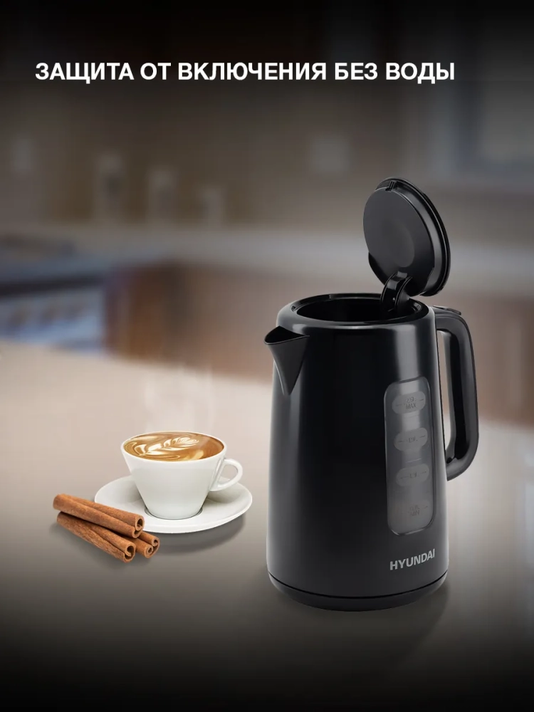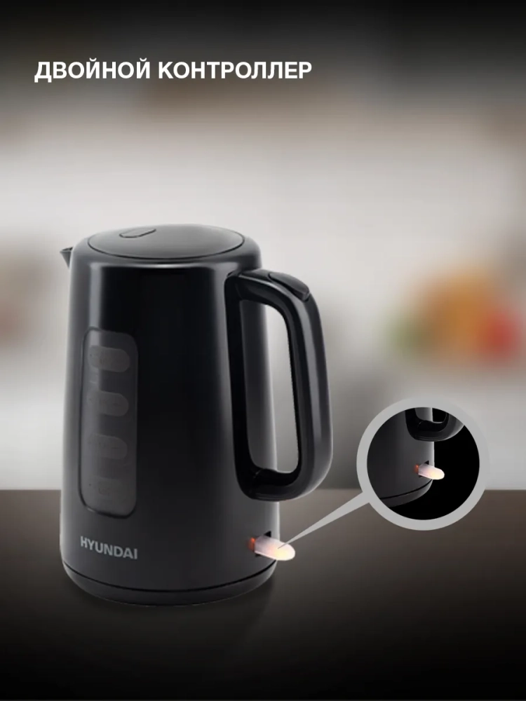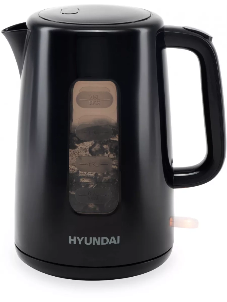 Первое из них – внушительный внутренний объём, рассчитанный на 2,5 л воды. Чтобы нагреть полную ёмкость до состояния кипятка, прибору требуются считанные моменты. Это возможно благодаря предусмотренной мощности в 2200 Вт и высокотехнологичному скрытому в подставке нагревательному элементу. На ней чайник Hyundai HYK-P2501 проворачивается на 360 градусов.