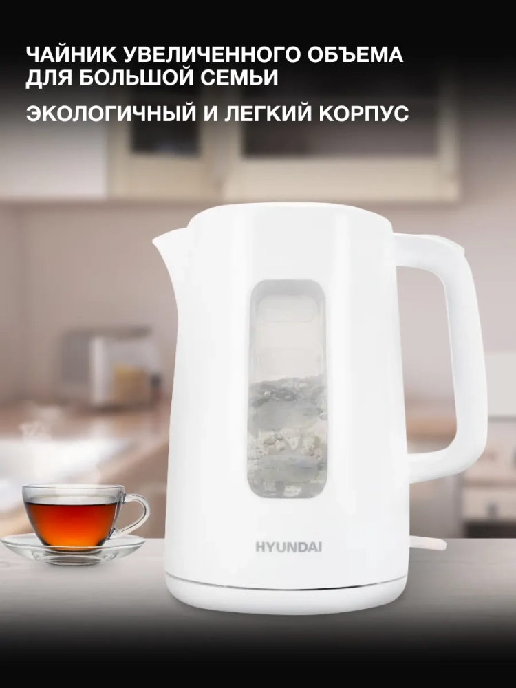 Электрический чайник увеличенного объема Hyundai HYK-P3501 отлично подойдет для большой семьи и массовых застолий к кругу друзей и близких. Наличие смотрового окна с мерными метками позволяет контролировать уровень воды внутри без открытия крышки. Благодаря белому корпусу классической формы модель легко вписывается в любой интерьер.