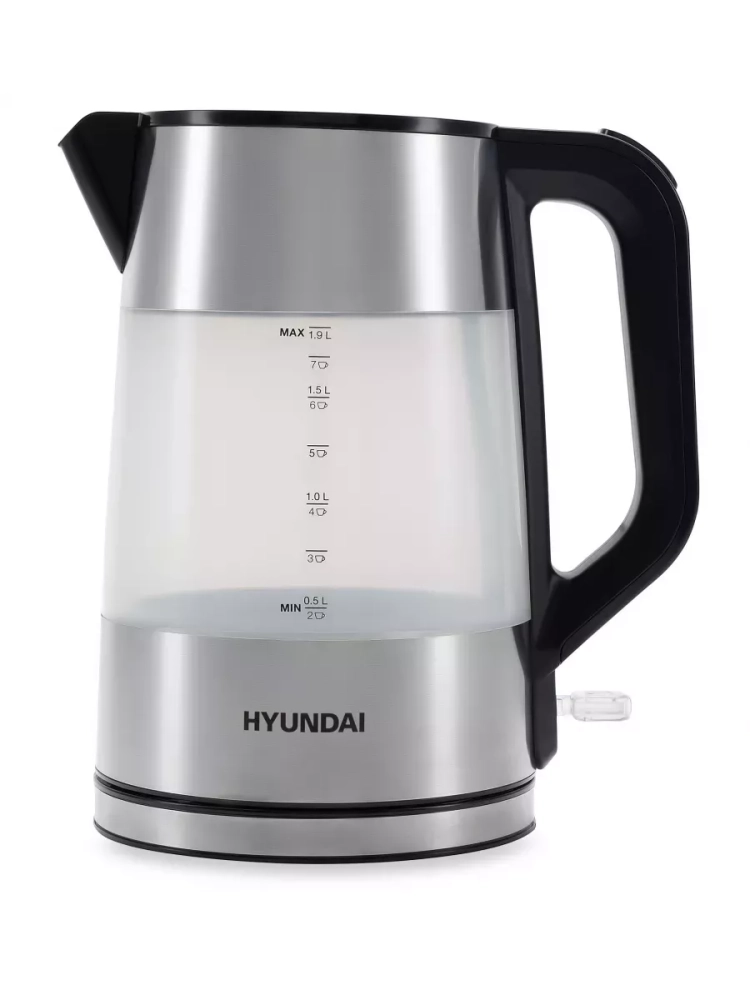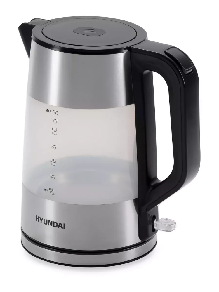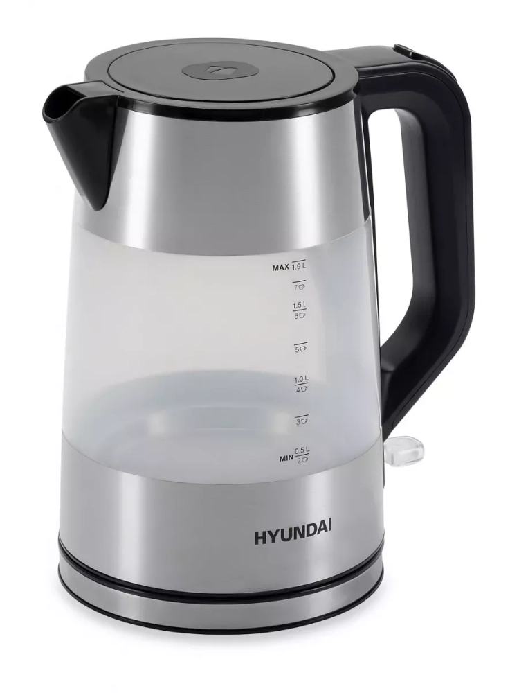 Вместимость Hyundai HYK-P4026 составляет 2 л, благодаря 2200 Вт предусмотренной мощности цикл нагрева занимает несколько минут. Элемент, ответственный за кипячение, эргономично скрыт в подставку, она позволяет проворачивать чайник на 360 градусов. В носике устройства расположен удобный и функциональный фильтр-сеточка для накипи. Крышка прибора открывается по щелчку кнопки и так же просто закрывается. Под рукояткой чайника находится кнопка активации и световой индикатор, показывающий, что прибор работает.