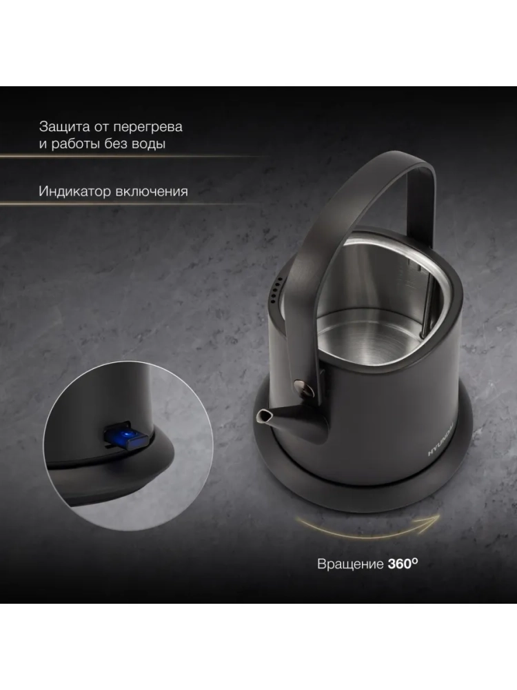 Для удобства пользователя чайник оснащен индикатором включения. Подставка с функцией вращения на 360 градусов позволяет установить чайник на базу с любой стороны, что удобно для использования как правой, так и левой рукой. Автоматическое отключение при закипании воды и защита от включения без жидкости обеспечивают безопасную эксплуатацию, исключая риск перегрева и поломки.