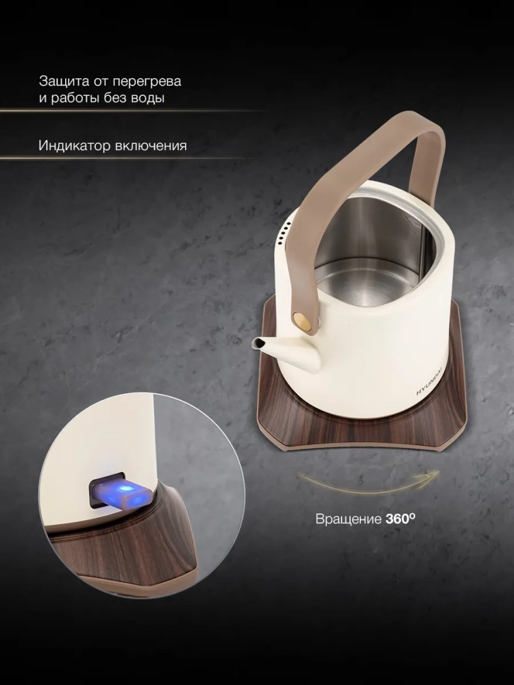 Безопасность эксплуатации обеспечивается автоматической защитой от включения без воды, что исключает перегрев и продлевает срок службы прибора. Индикатор включения позволяет одним взглядом понять, работает чайник или нет. Поворотная подставка на 360 градусов делает использование устройства удобным как для правшей, так и для левшей — чайник можно устанавливать в любом положении.