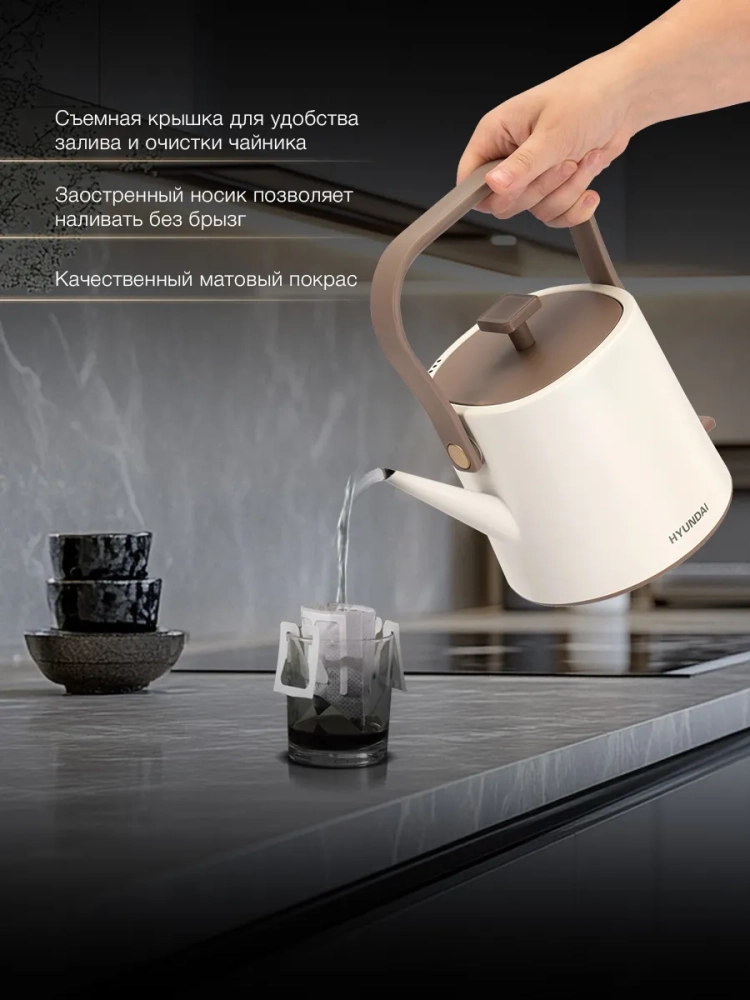 Для удобства использования предусмотрена съемная крышка, которая облегчает залив воды и уход за внутренней поверхностью. Заостренный носик обеспечивает ровную и аккуратную струю, исключая разбрызгивание — удобно при заваривании чая или приготовлении кофе вручную.