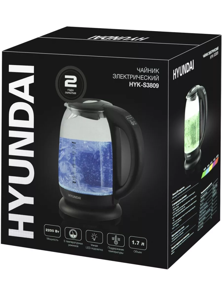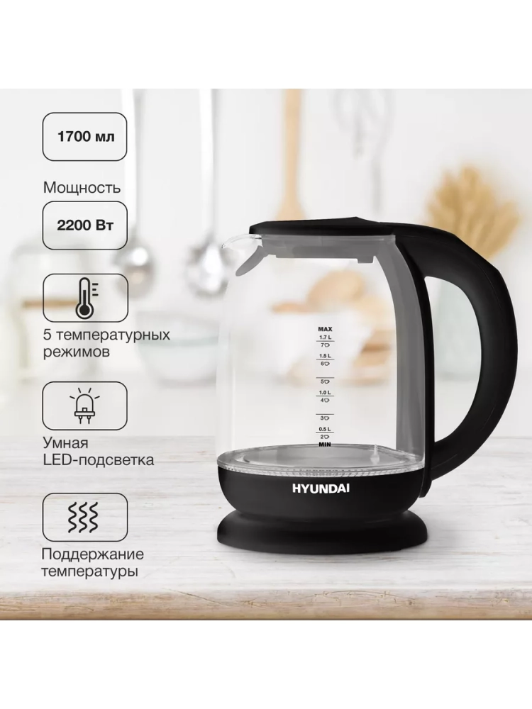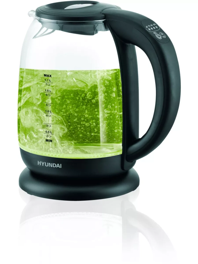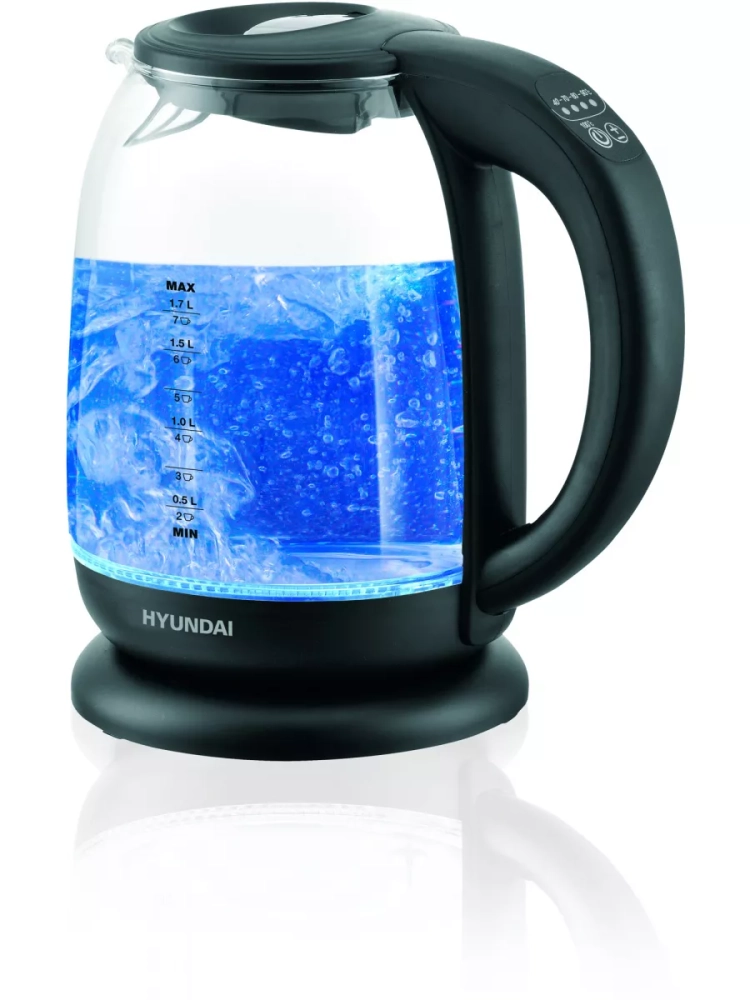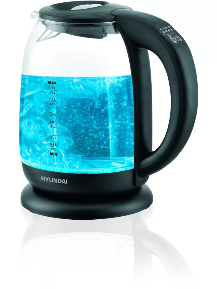 Чайник электрический Hyundai HYK-S3809 черный, объём 1.7л, мощность 2200Вт, материал корпуса: стекло/пластик. Оснащен панелью управления для выбора температуры и её индикации.