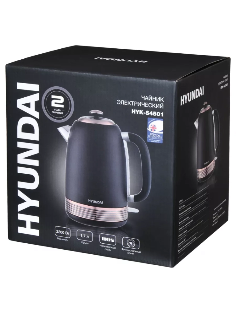 Чайник электрический Hyundai HYK-S4501 черный/бронзовый, объём 1.7л, мощность 2200Вт, материал корпуса: металл/пластик. Технологичный и современный чайник в стиле БАРРОКО. Оснащен контроллером STRIX – надежный и долговечный контроллер Английской компании с дополнительной гарантией 10 лет, легкосъемный моющийся нейлоновый фильтр, полностью съемная крышка , корпус из высококачественной нержавеющая стали HQS.