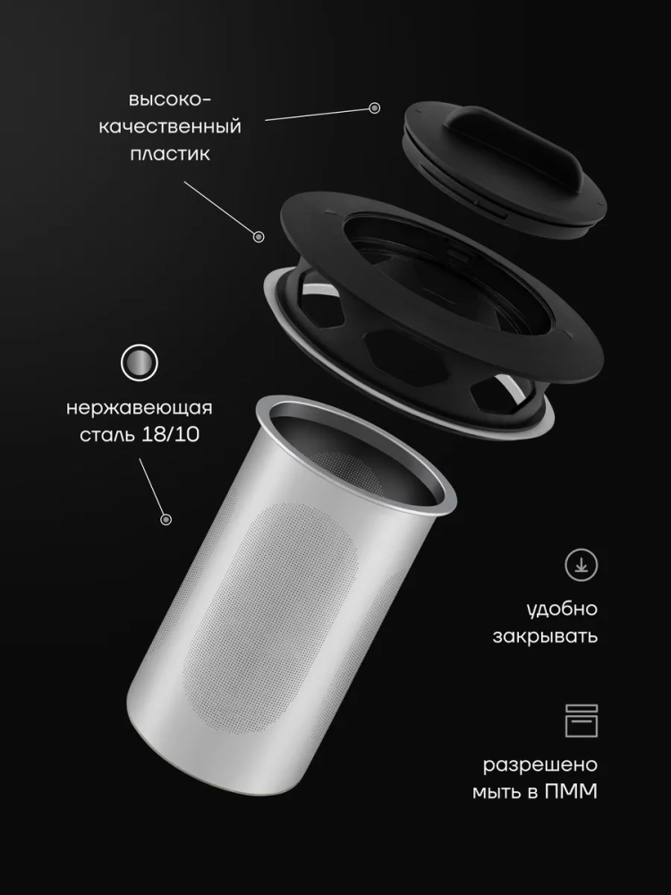 Фильтр изделия изготовлен из высококачественной медицинской нержавеющей стали 18/10, которая отличается устойчивостью к коррозии и обладает антибактериальными свойствами. Это гарантирует безопасность использования и препятствует размножению вредных микроорганизмов. Фильтр - ситечко из нержавеющей стали способствует высокому качеству фильтрации напитка, что позволяет использовать ингредиенты мелкого помола во время заварки.