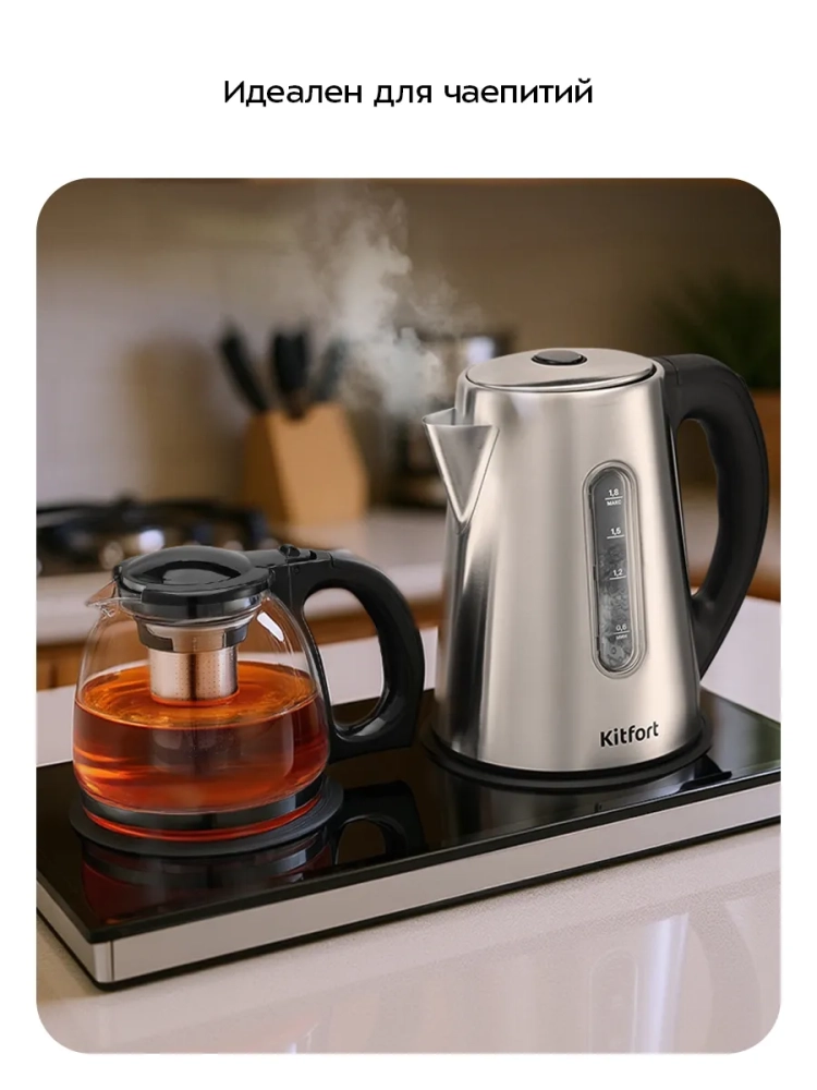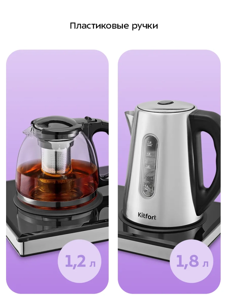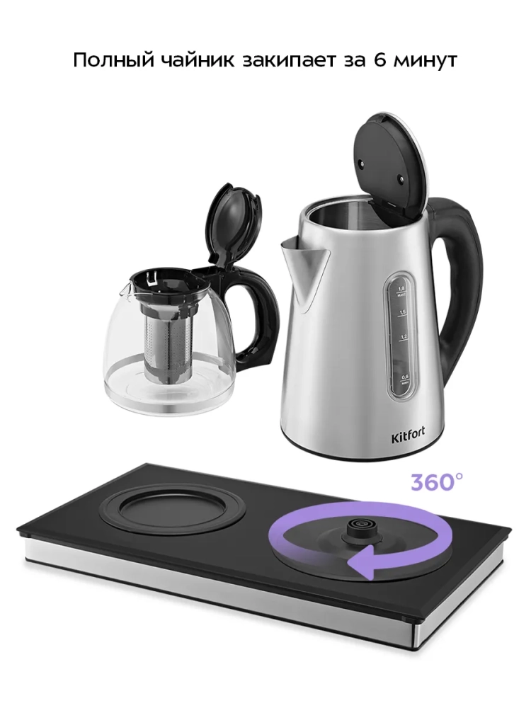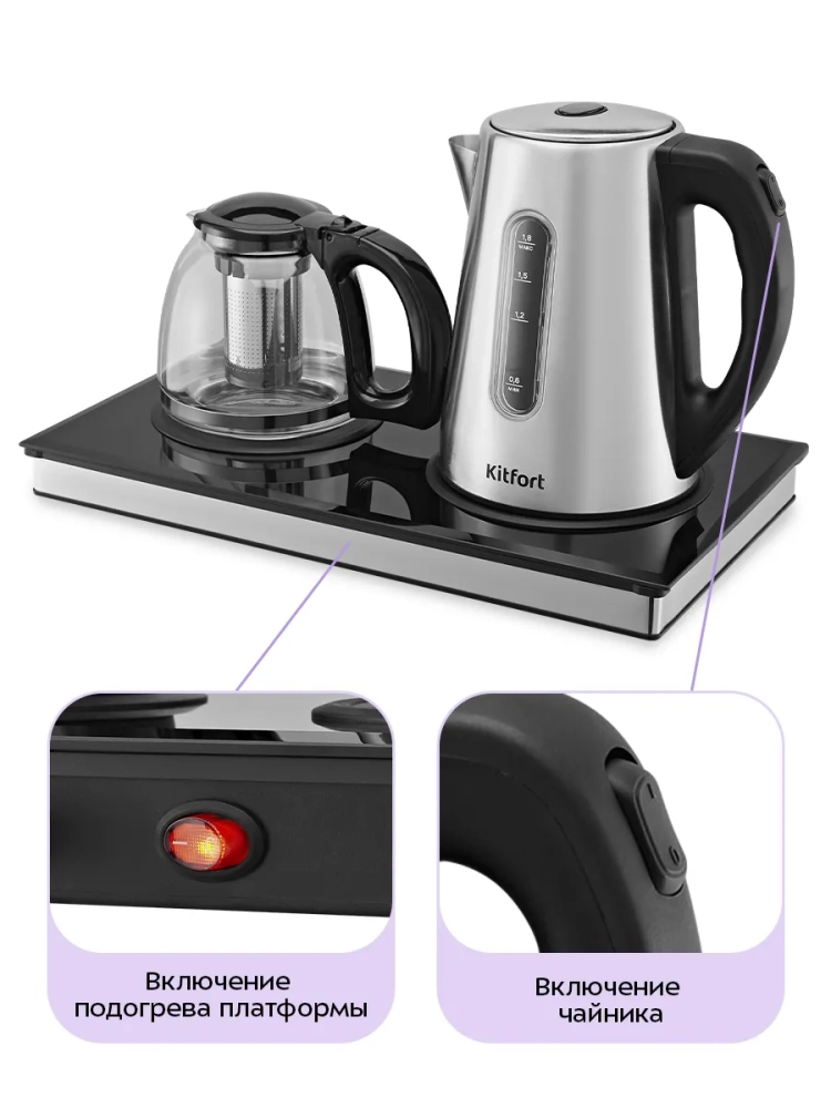 Чайный набор Kitfort КТ-6777 состоит из чайника емкостью 1,8 л, заварочного чайника с фильтром емкостью 1,2 л и базы. Набор поможет вам не только вскипятить воду, но и заварить чай или кофе в заварочном чайнике, а также сохранять готовый напиток теплым за счет платформы с подогревом.