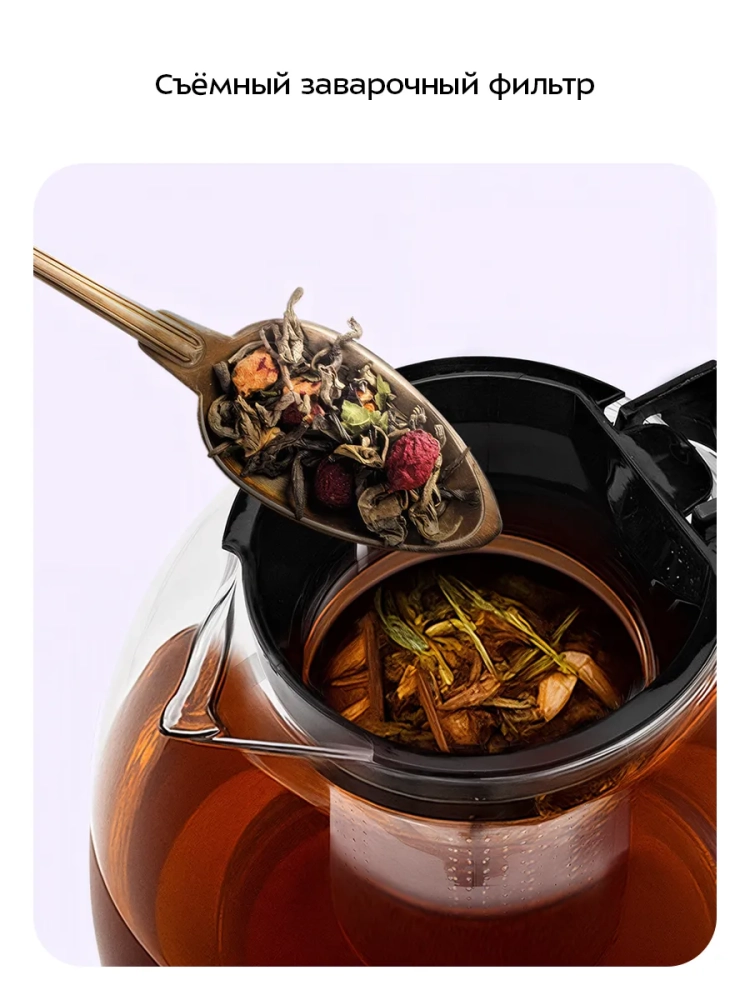 Заварочный чайник изготовлен из термостойкого стекла и имеет съемный фильтр из нержавеющей стали для чая или кофе. Крышка выполнена из сочетания пластика и нержавеющей стали, а ручка из пластика. В месте установки заварочного чайника на базу находится платформа с подогревом, благодаря которой вы можете сохранить готовый напиток теплым. Время поддержания температуры составляет 24 часа.